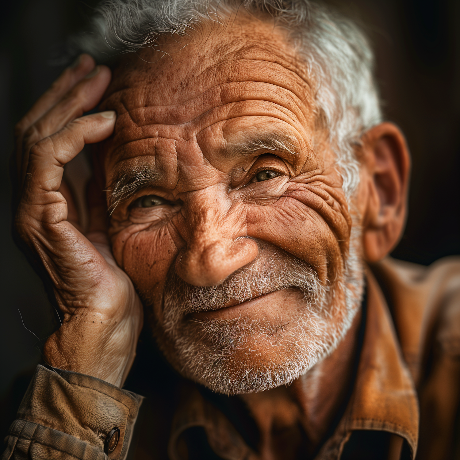 Elderly man with white hair and beard, wearing a brown shirt, resting his hand on his cheek with a warm, gentle expression.