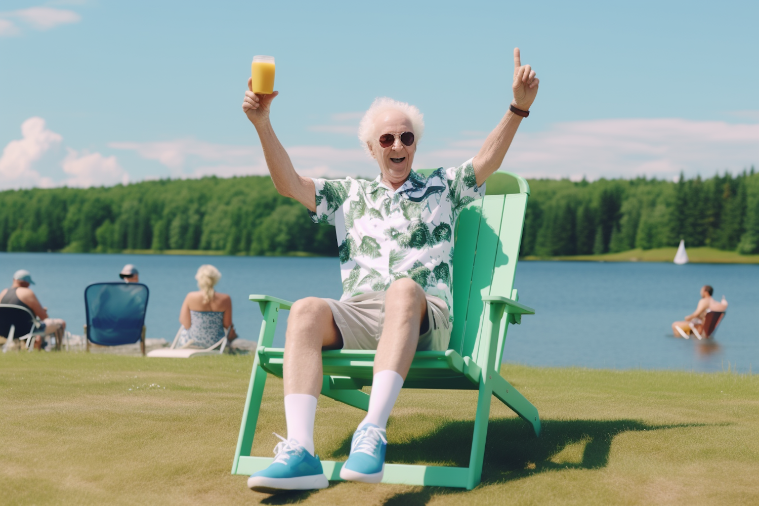 Elderly man in tropical shirt celebrates by a lake, holding orange juice, surrounded by people relaxing under a clear blue sky.