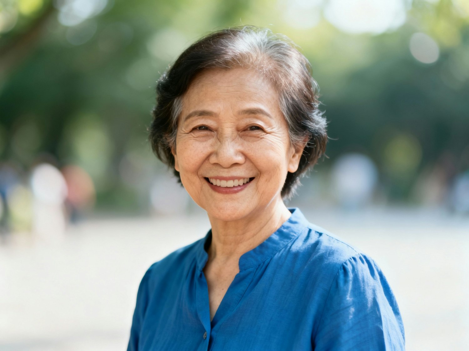 An asian cheerful elderly woman in a blue blouse, focused on woman, bokeh, smiling at camera