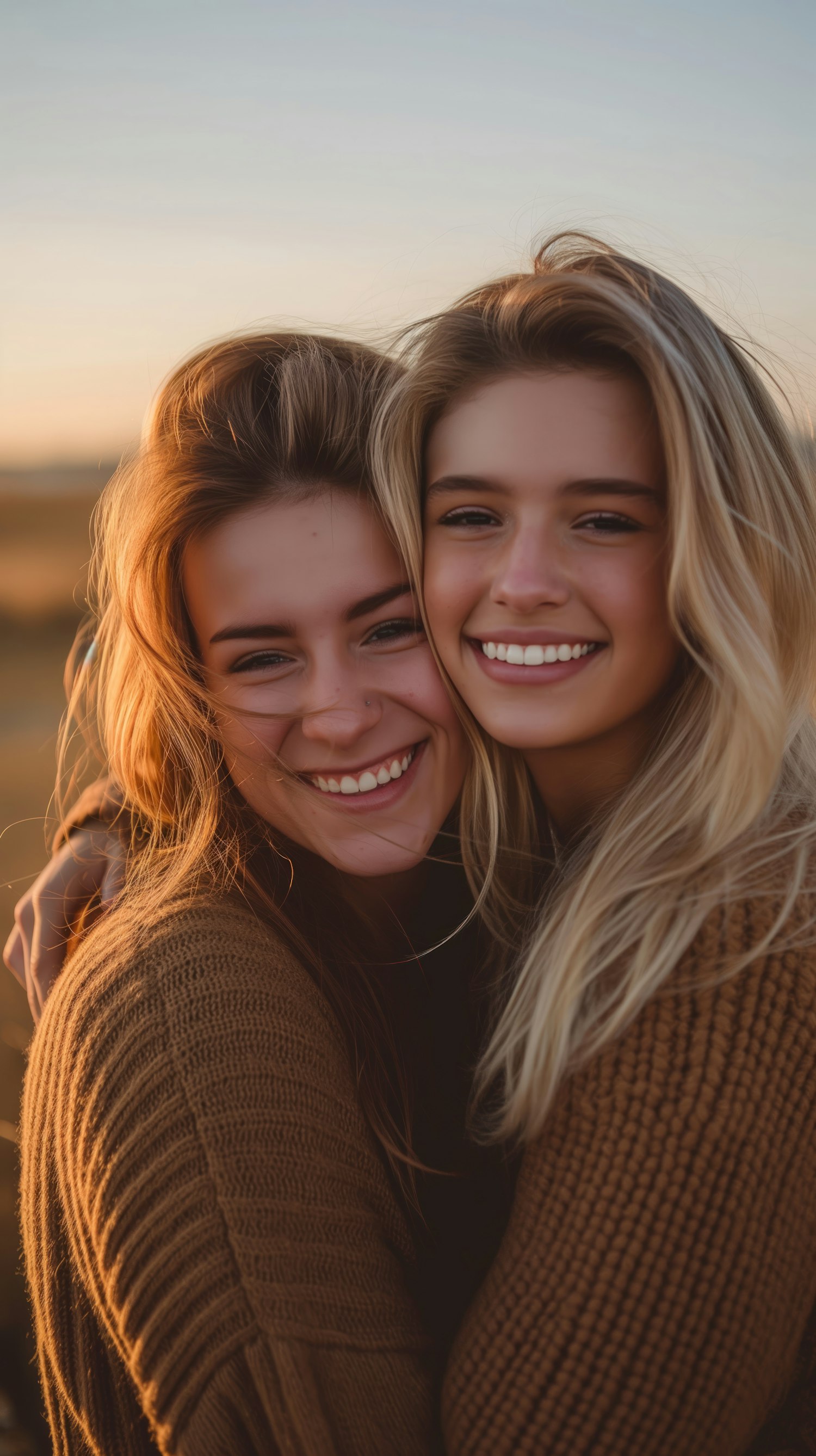 Two individuals with long hair embrace in warm, knitted sweaters under a soft sunset glow, faces blurred for privacy.