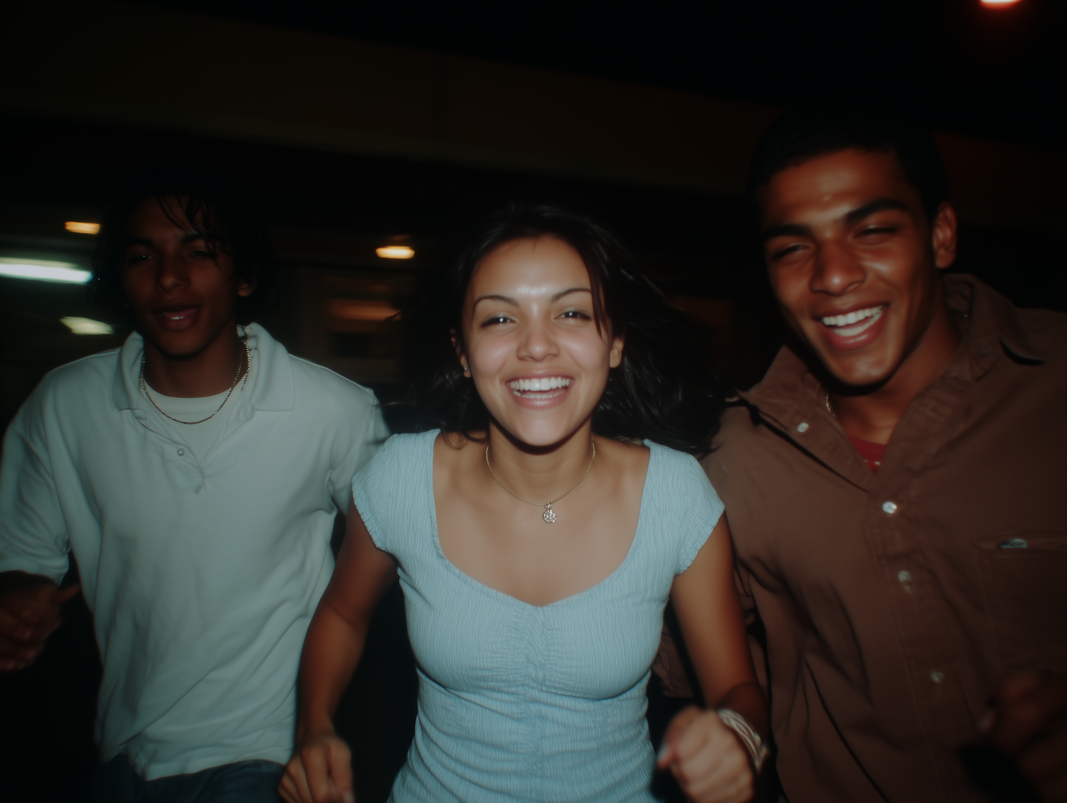 Three friends running and laughing together at night, radiating joy and energy in a candid, motion-filled moment.