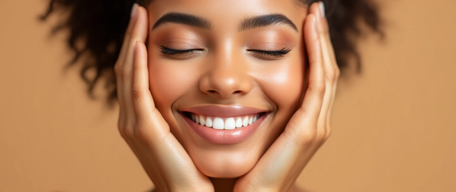 A young woman with glowing skin smiles with eyes closed, hands on face, against a warm beige background. Radiant and serene.