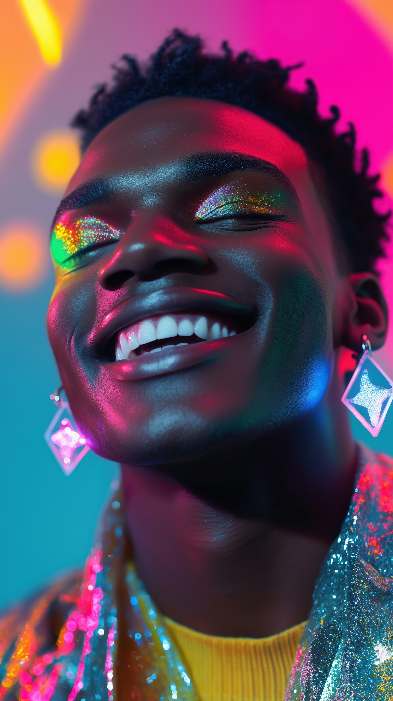 Vibrant portrait of a joyful person with colorful makeup and sparkling attire, set against a neon-lit background.