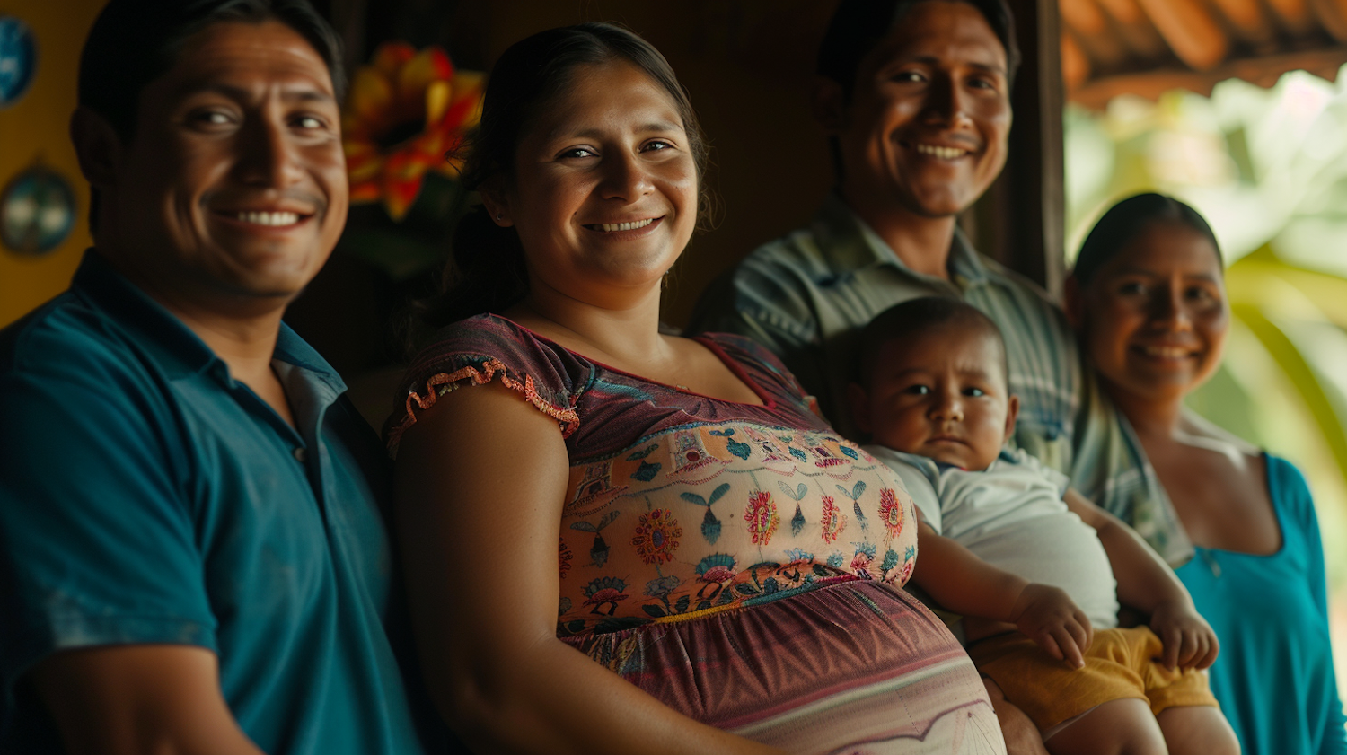 A cheerful family portrait featuring a pregnant woman, a baby, and three adults in a warm, rustic setting with soft lighting.
