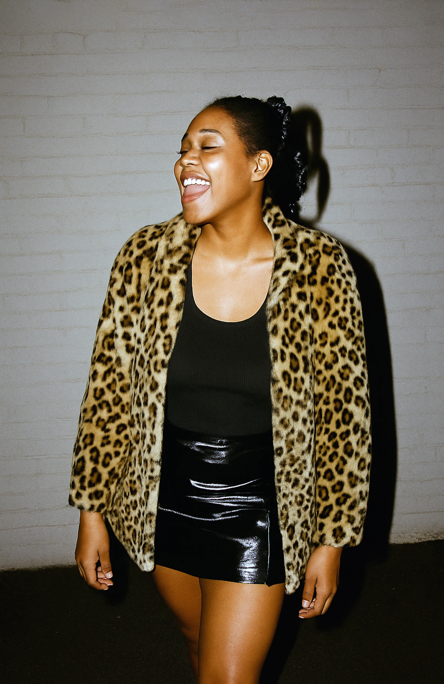 A stylish woman in a leopard-print coat and vinyl skirt laughing joyfully against a white brick wall.