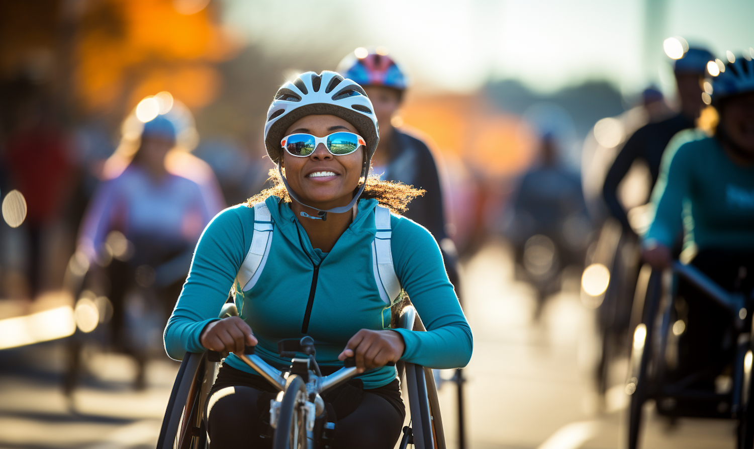 Joyful woman in a wheelchair race, wearing a teal top and helmet, surrounded by fellow racers in a sunlit event.