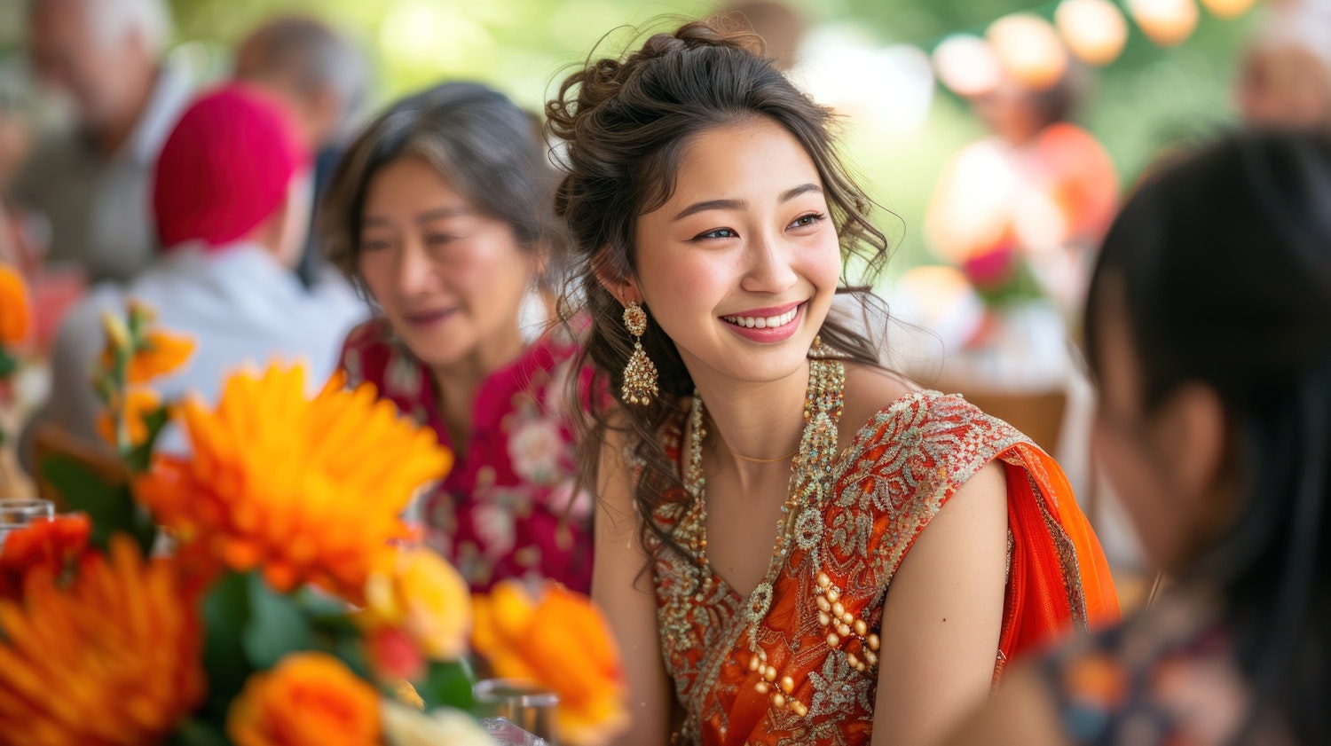 Smiling woman in vibrant traditional attire at a festive gathering, surrounded by colorful flowers and joyful ambiance.