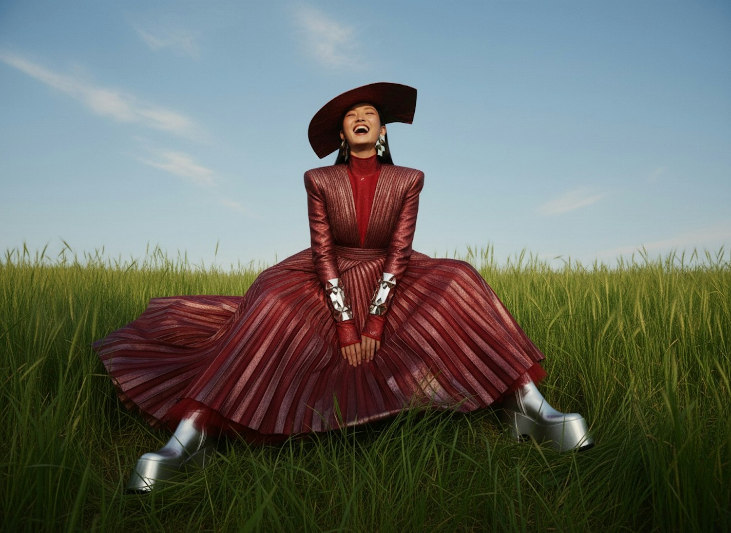 A person in a vibrant red pleated outfit and wide-brimmed hat sits joyfully in a green field under a clear blue sky.