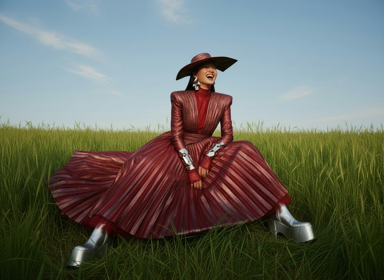 A person in a red pleated dress and silver boots sits in a green field, laughing under a clear blue sky, blending fashion and nature.