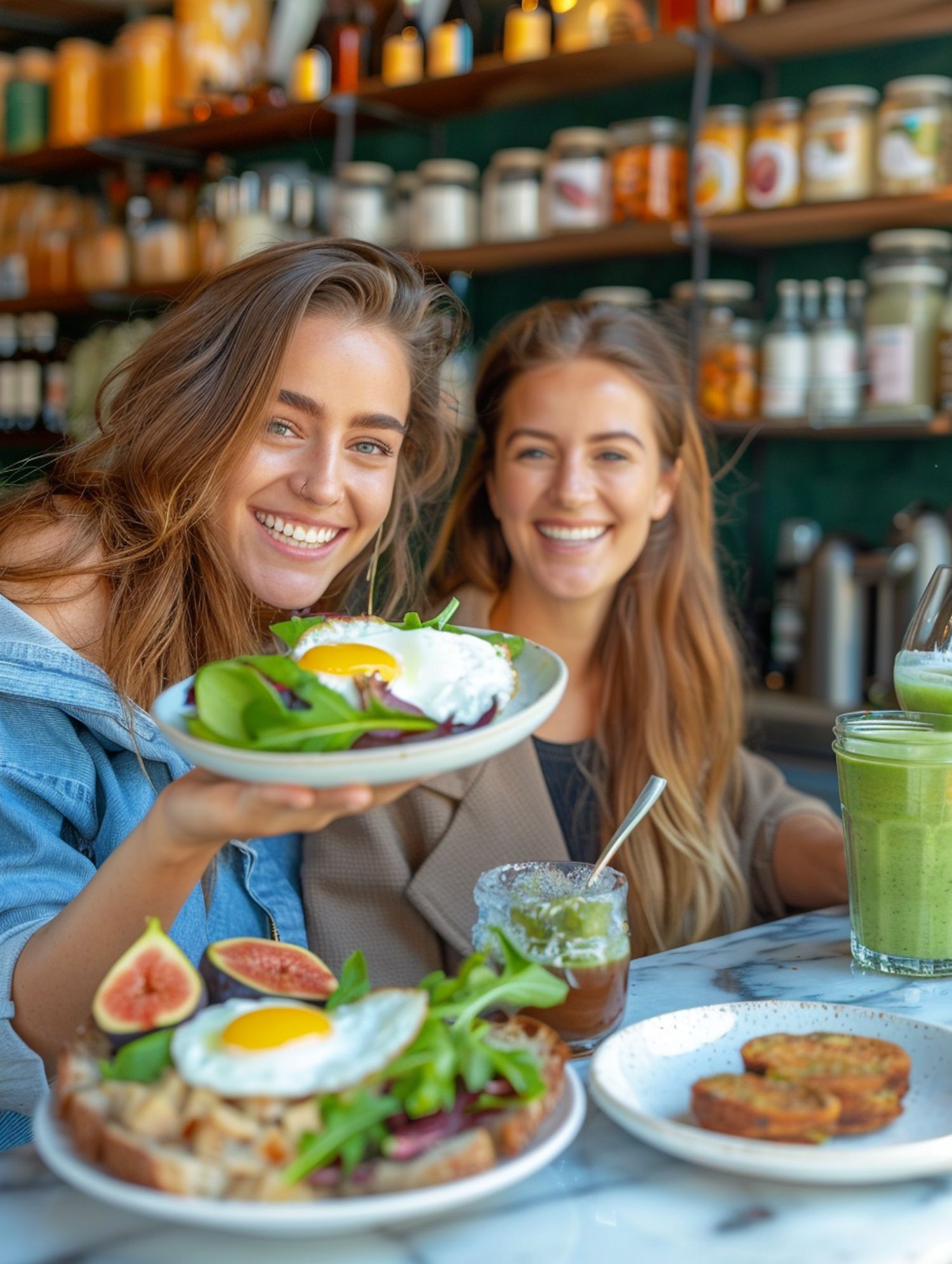 Two women enjoying a healthy brunch with salads, toast, and smoothies in a cozy café with rustic decor and natural lighting.