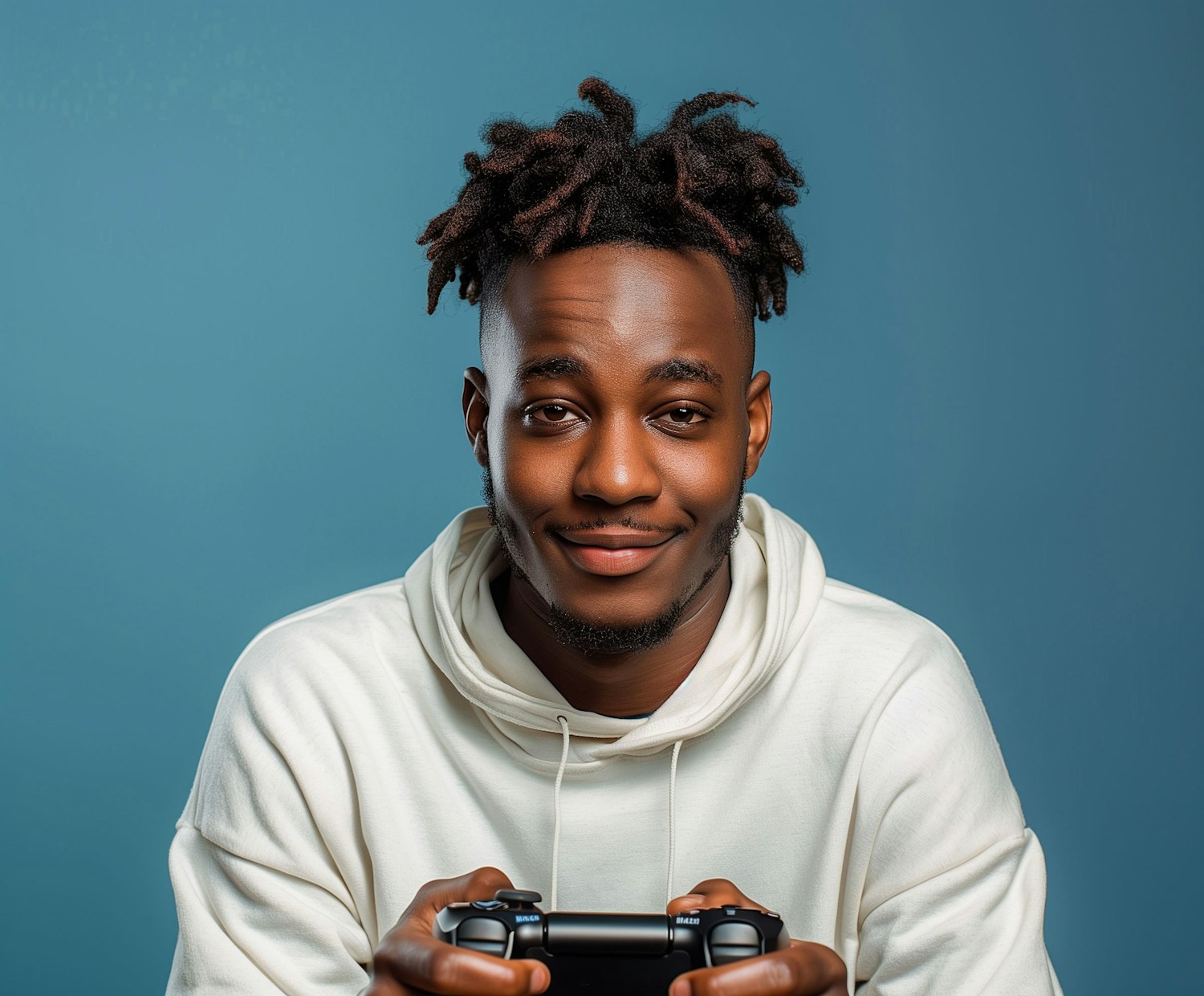 Young man with a white hoodie and a game controller, smiling against a blue background.