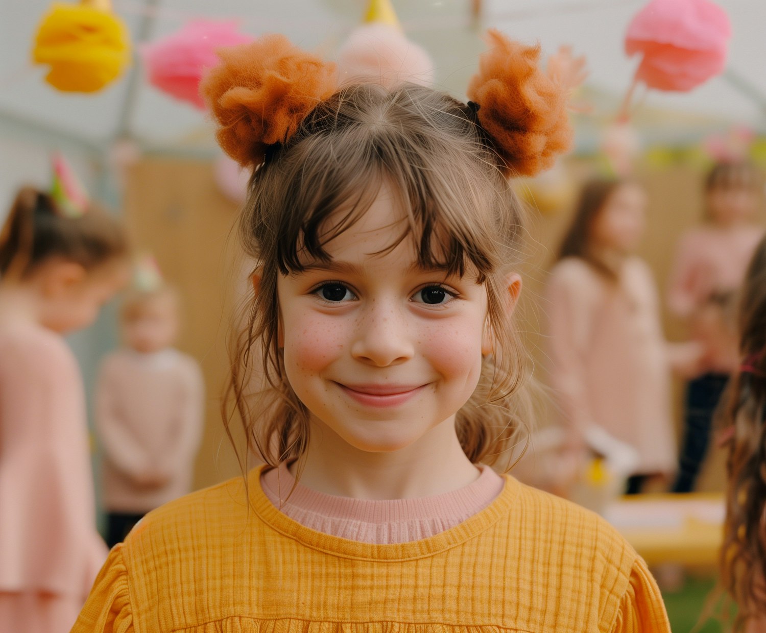 Smiling girl with orange pom-pom hair at a colorful party, wearing a mustard dress. Festive decorations and children in the background.