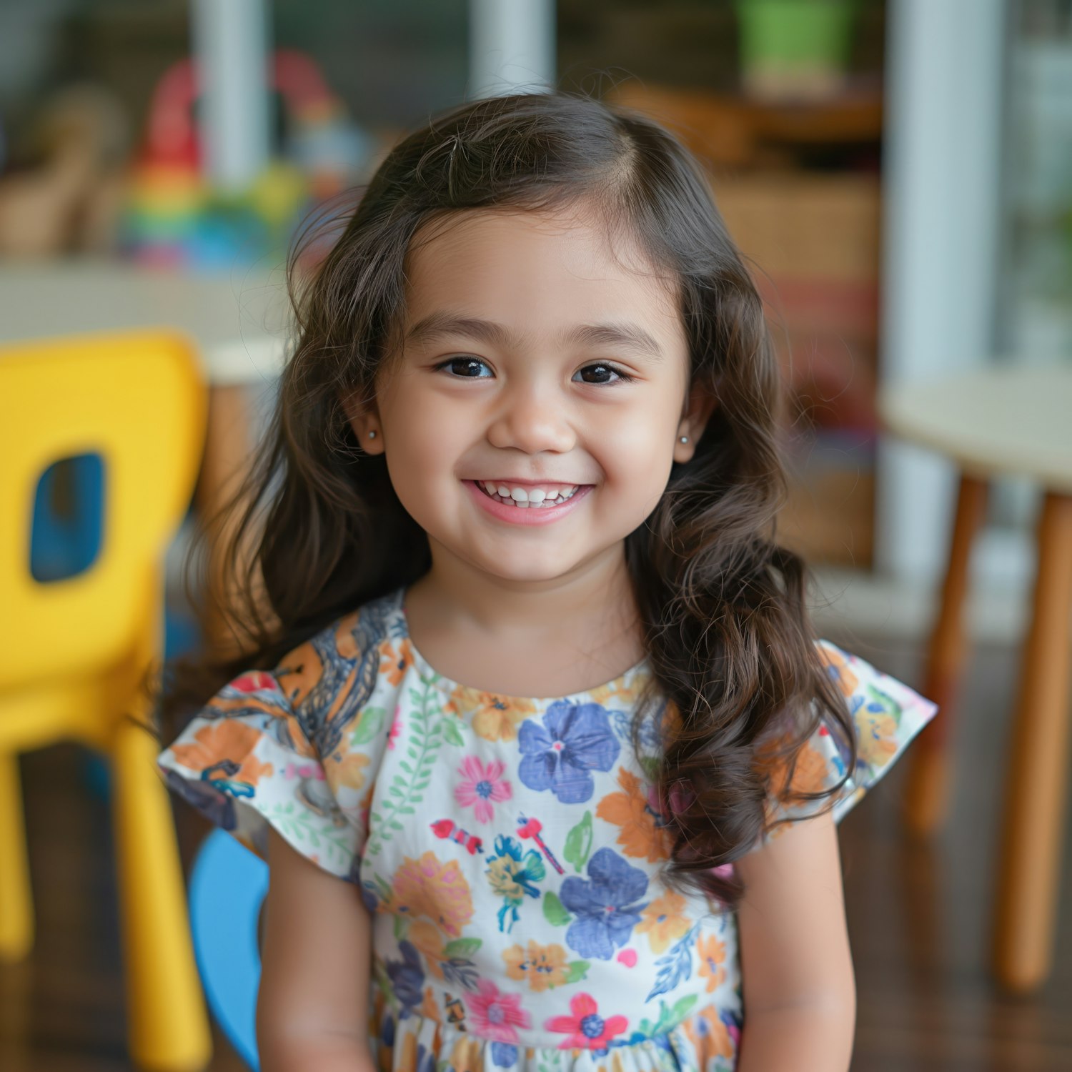 Smiling young girl in a colorful floral dress, standing in a vibrant playroom setting with colorful chairs and tables.
