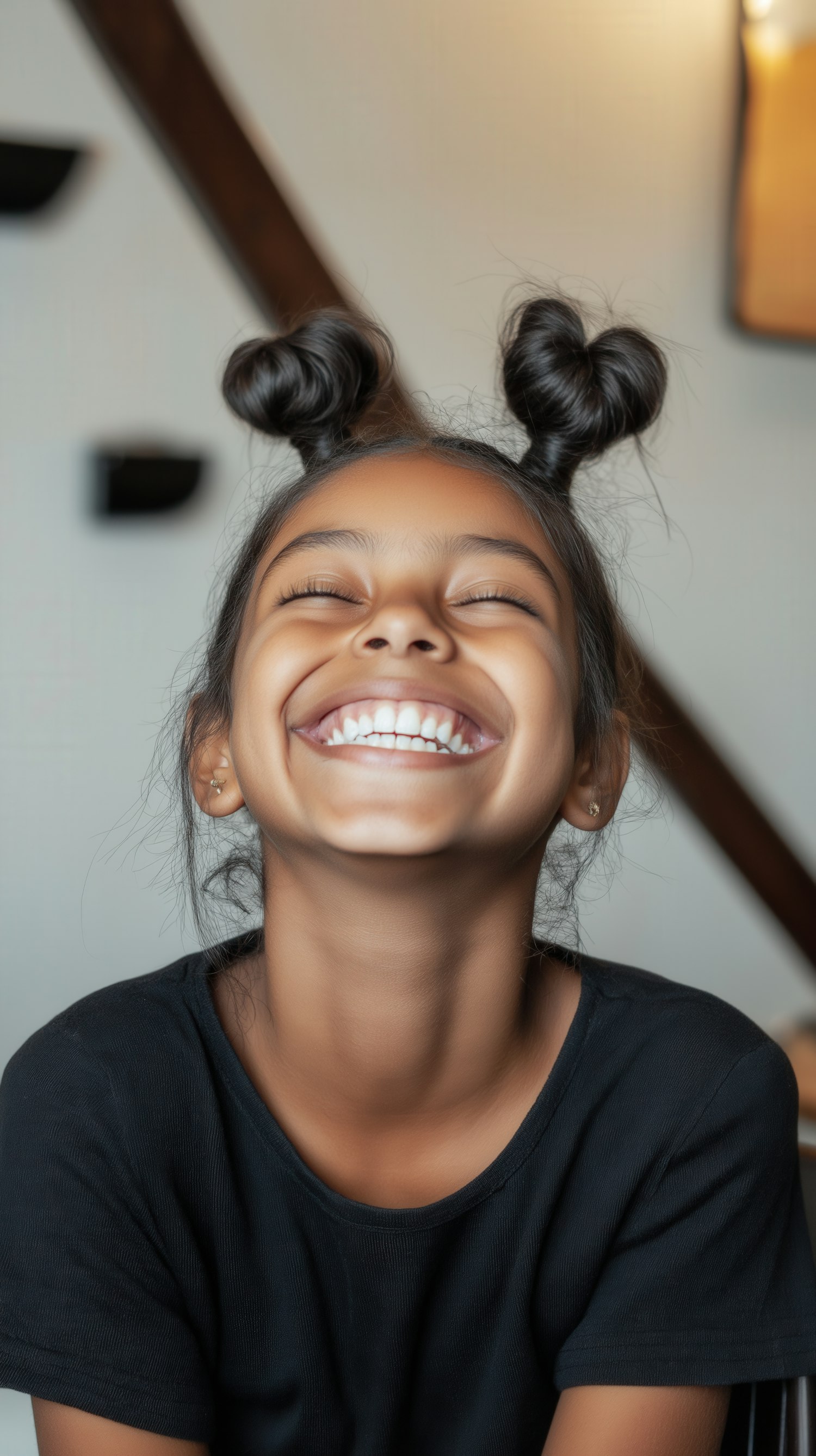A joyful young girl with playful hair buns and a radiant smile, wearing a black t-shirt, captured in a warm, cozy setting.