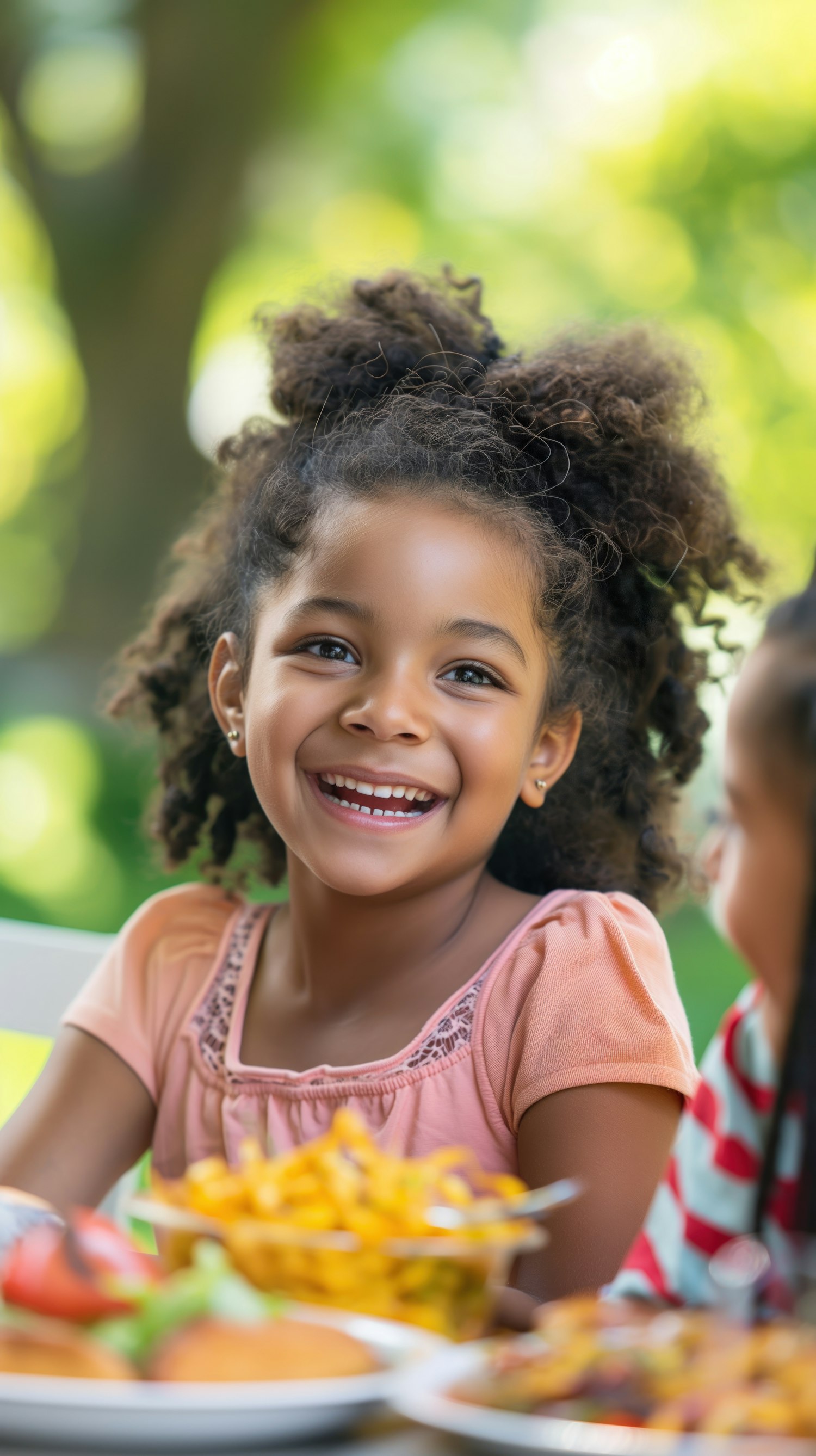 Smiling young girl enjoying a sunny picnic with friends, surrounded by delicious food and vibrant greenery.