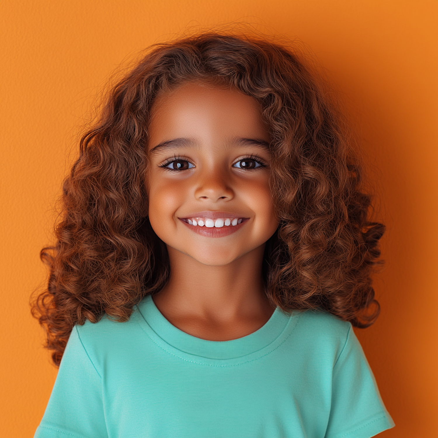 Smiling young girl with curly brown hair against a vibrant orange background, wearing a turquoise t-shirt.