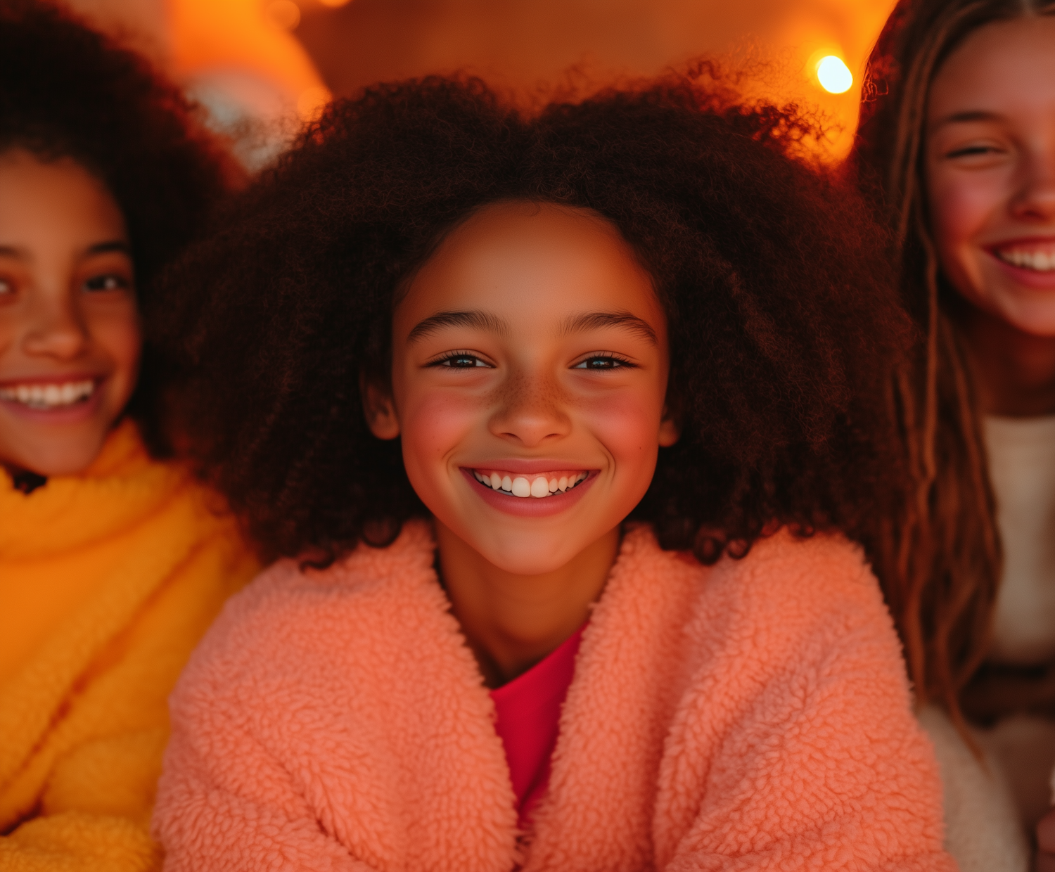Three smiling girls in cozy sweaters, surrounded by warm lighting, create a joyful and inviting atmosphere.