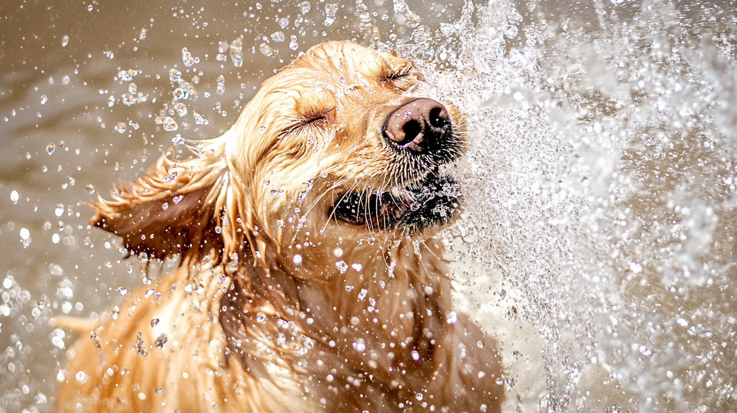 Golden retriever joyfully shaking off water, droplets sparkling in sunlight, capturing a playful and refreshing summer moment.