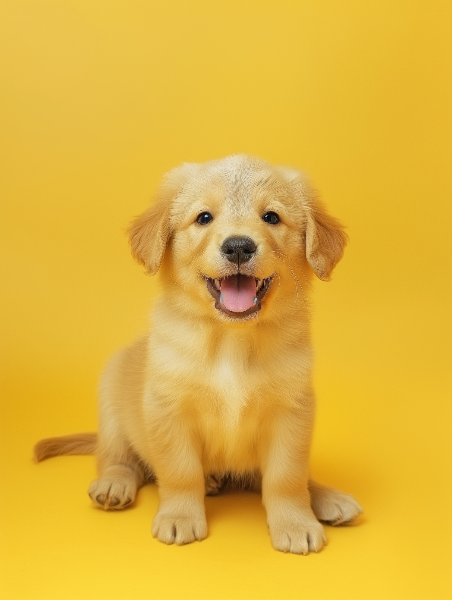 Adorable golden retriever puppy sitting against a bright yellow background, exuding joy and playfulness.