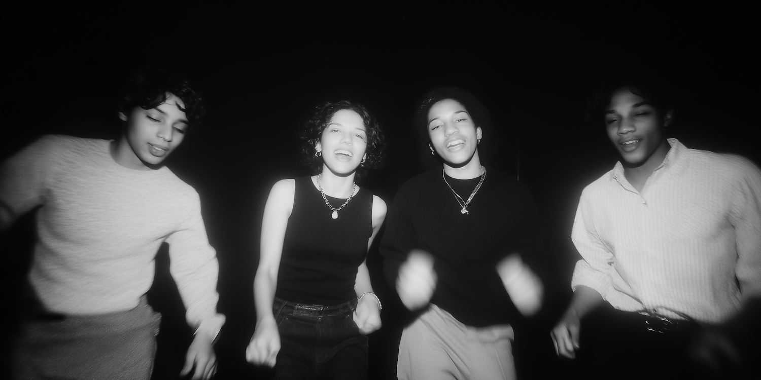 Black-and-white photo of four young adults smiling and dancing in a dark setting, dressed casually and radiating joy.