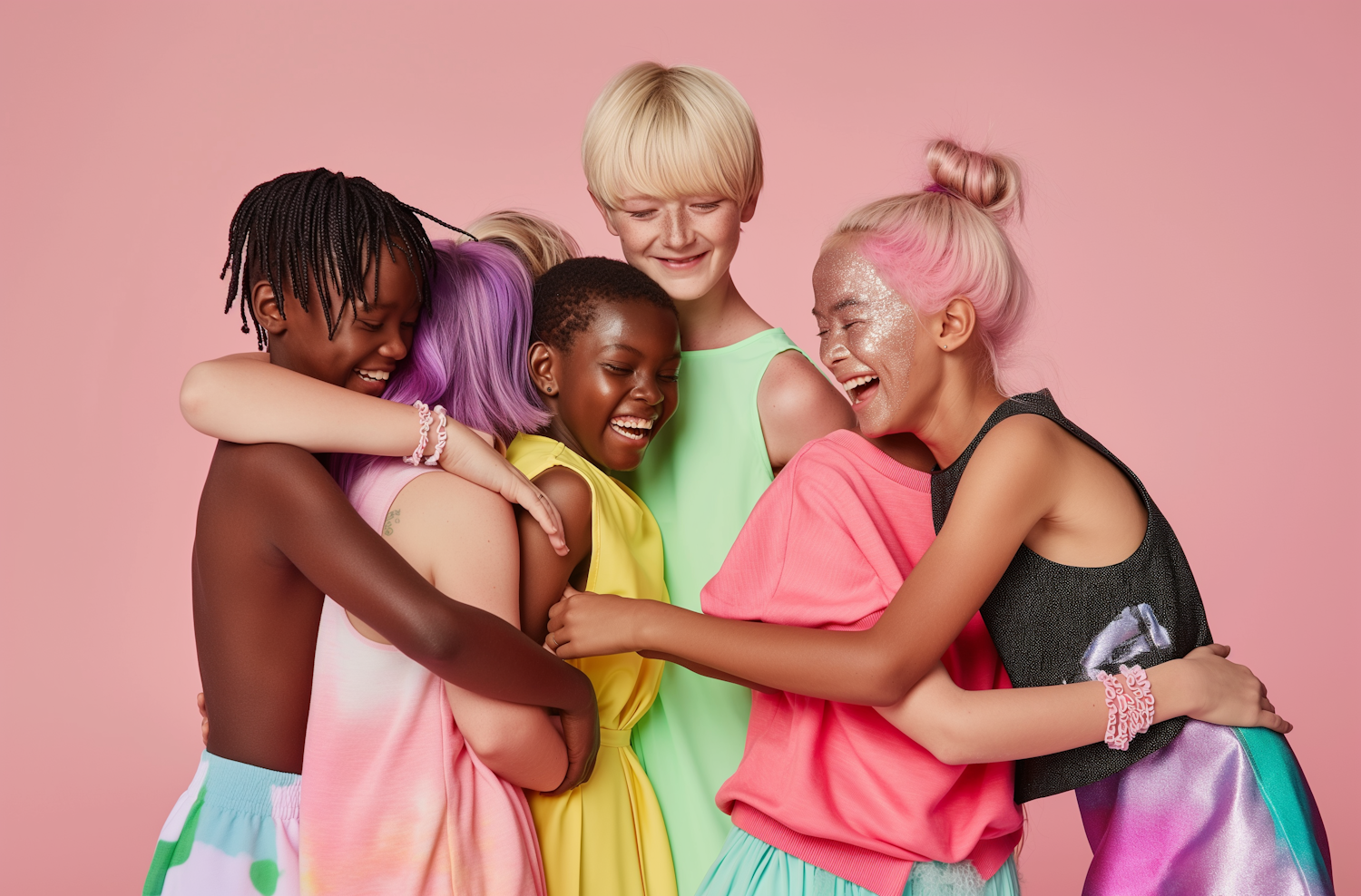 A joyful group hug with diverse individuals in colorful outfits, radiating happiness and inclusivity against a soft pink background.