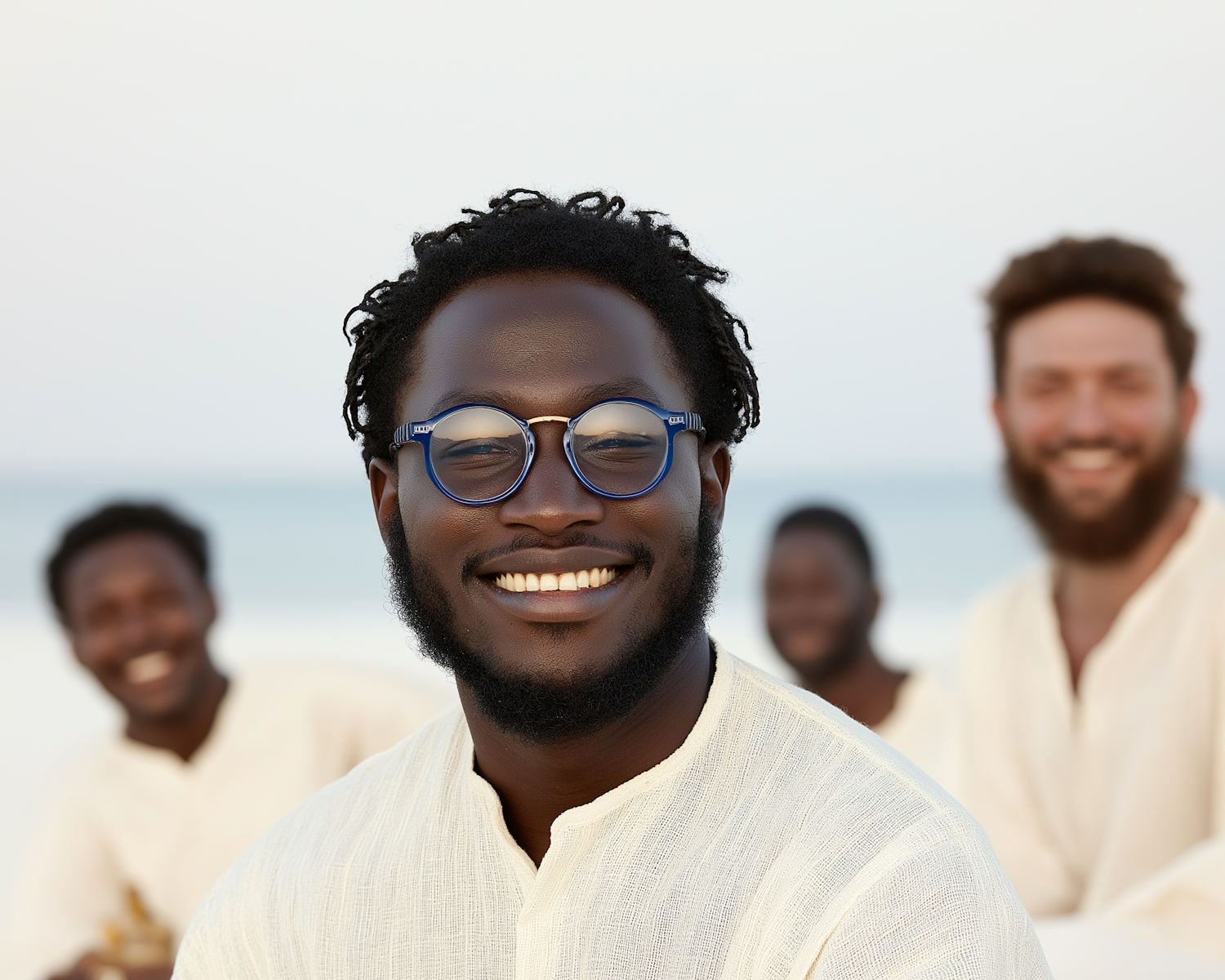 Smiling man in blue glasses with friends on a beach, wearing white shirts, exuding joy and warmth in a serene outdoor setting.