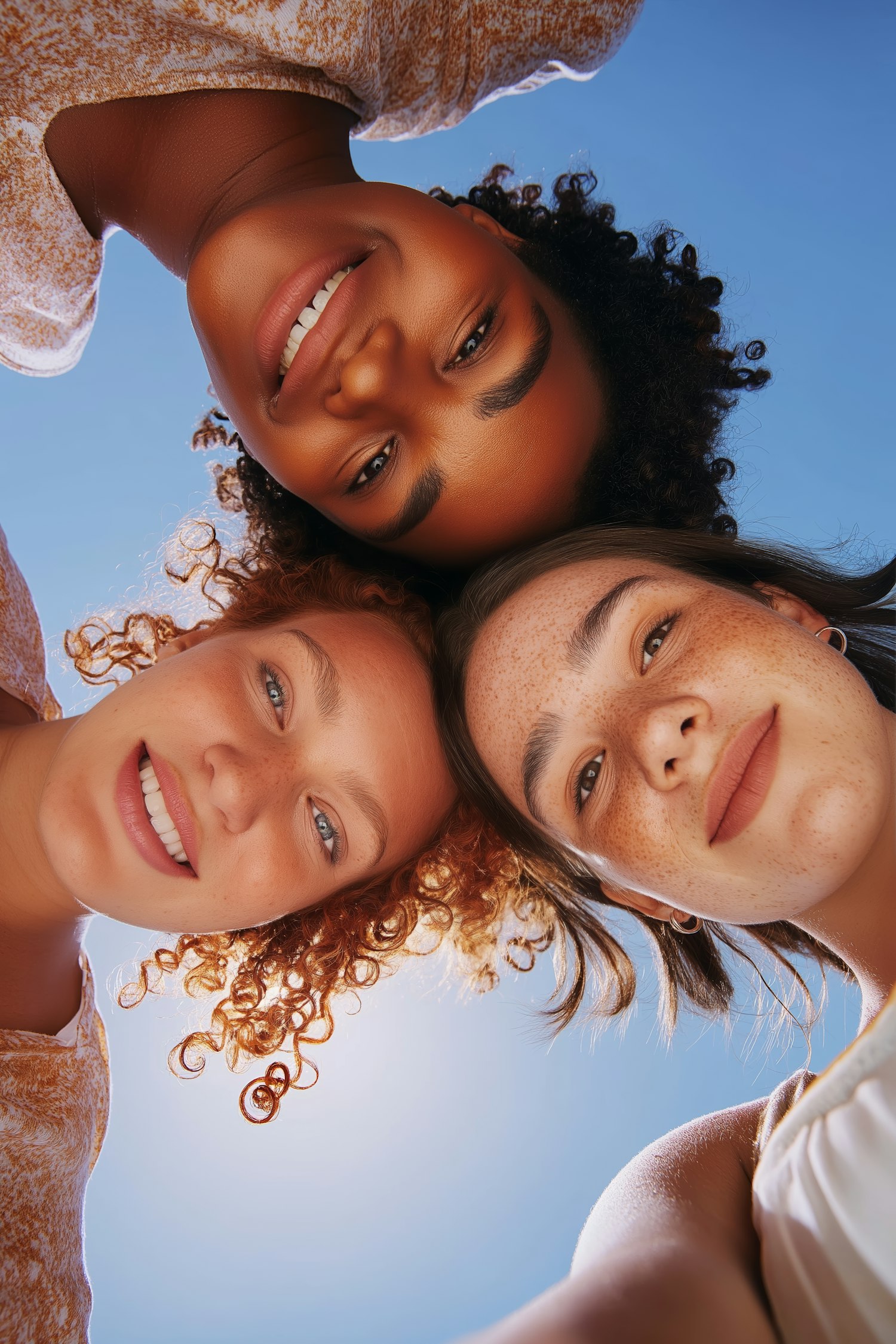 Three friends smiling together under a clear blue sky, showcasing diverse appearances and joyful expressions.
