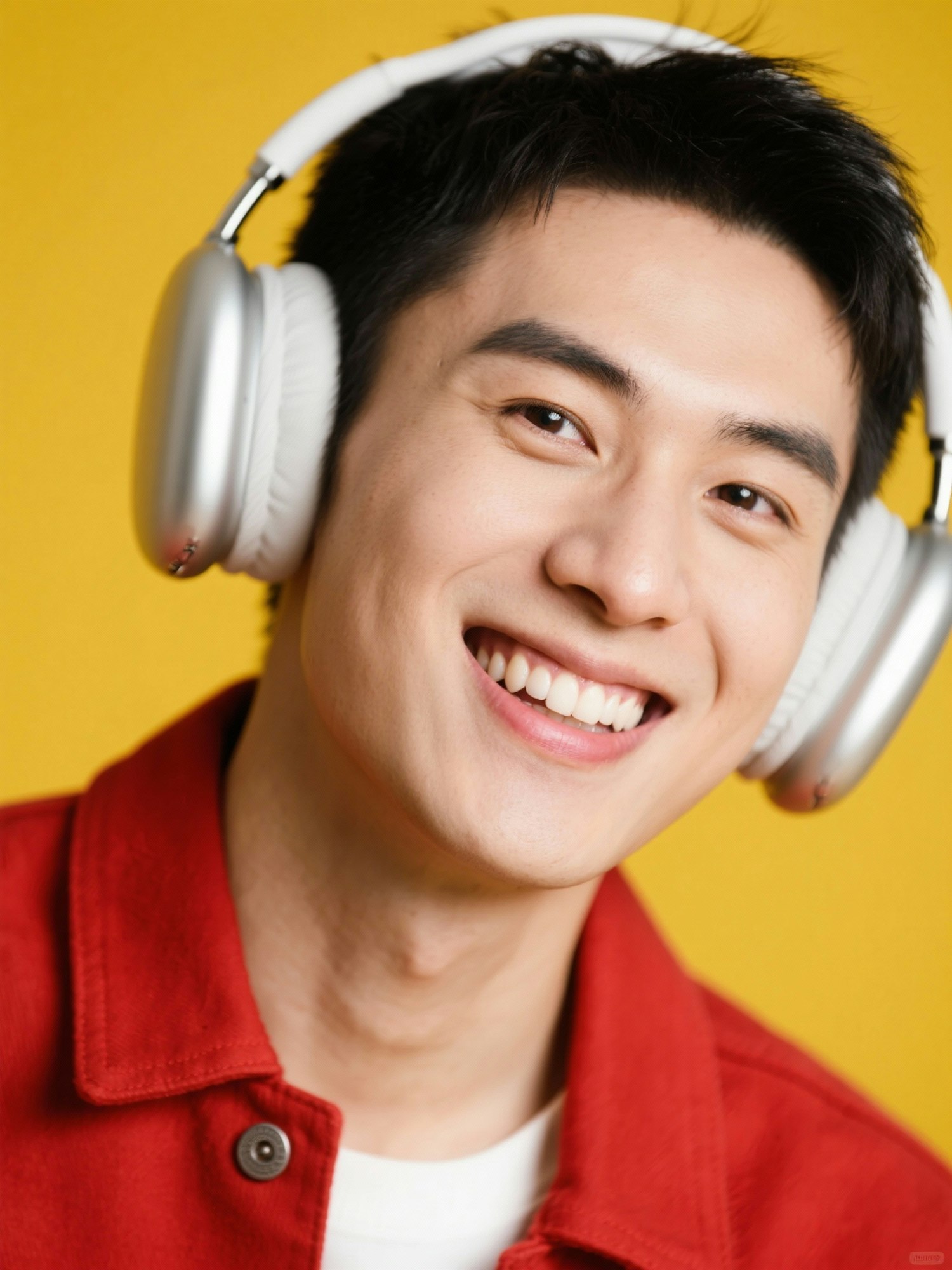 portrait photography of a happy young asian man wearing white over-ear headphones and a red jacket with buttons on a yellow background. he is smiling and looking at the camera, with a solid color studio backdrop. the image has high resolution, detailed skin texture, and natural lighting, and was shot using a hasselblad x2d camera.