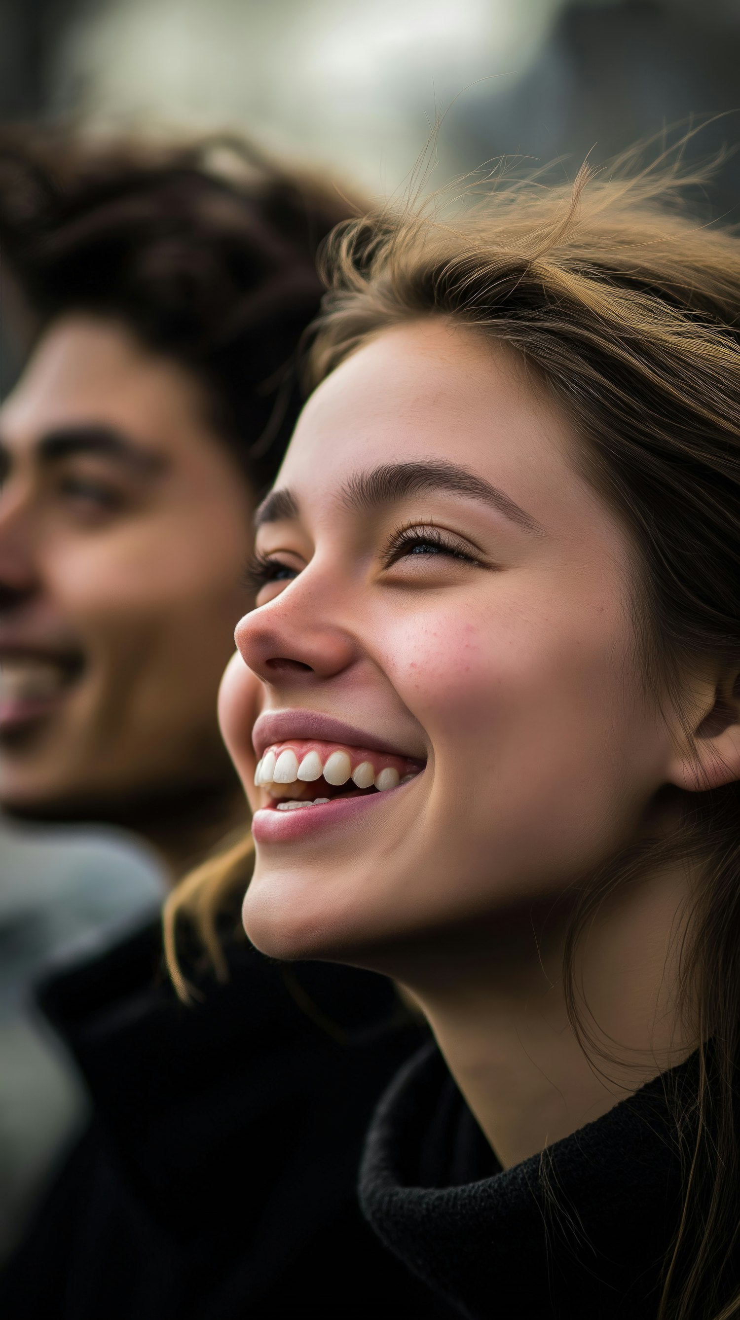 Close-up of two individuals with blurred faces, highlighting their hair and dark clothing against a soft, neutral background.