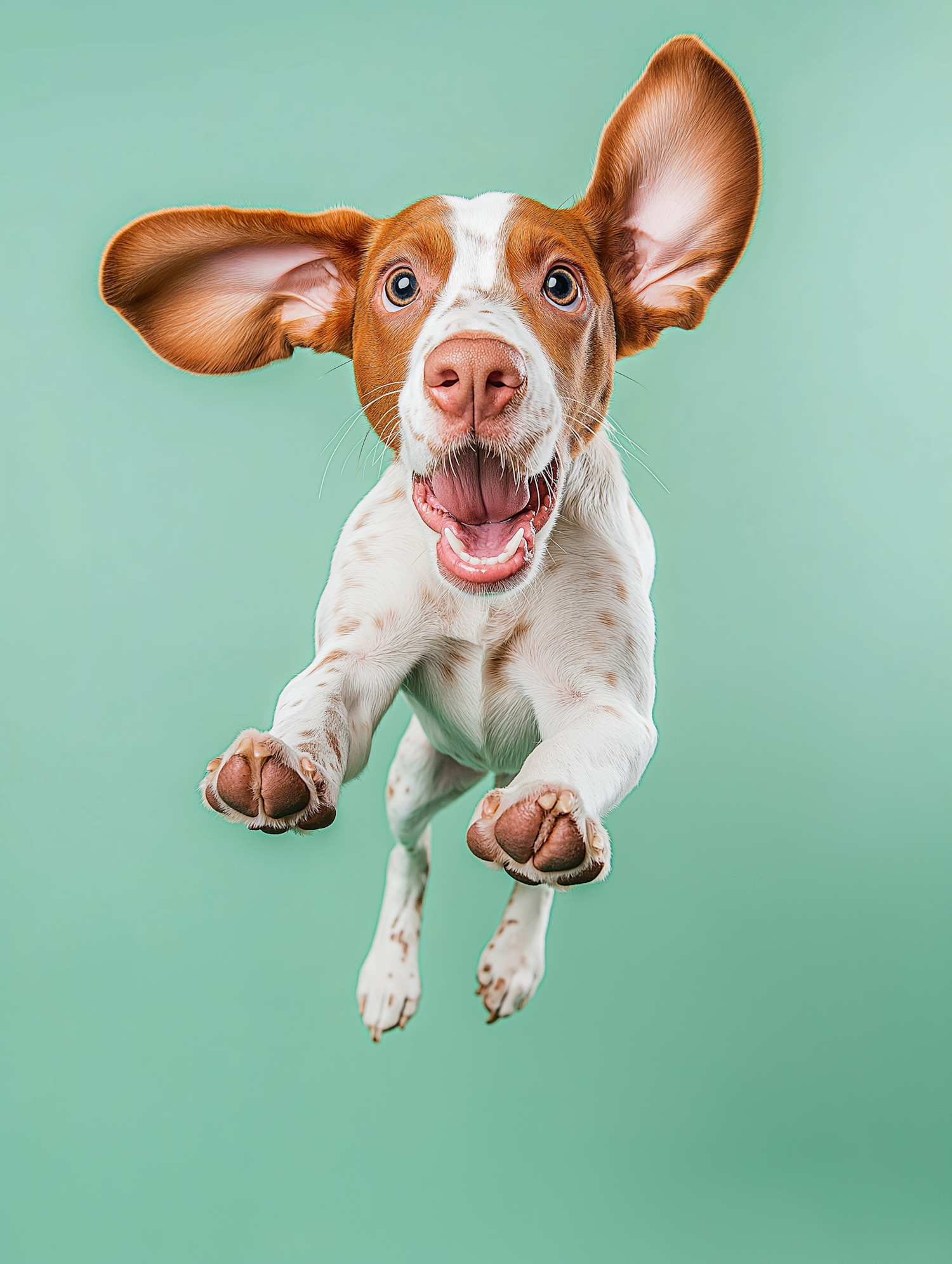 Energetic dog jumping mid-air with flapping ears against a mint green background, showcasing joy and playfulness.