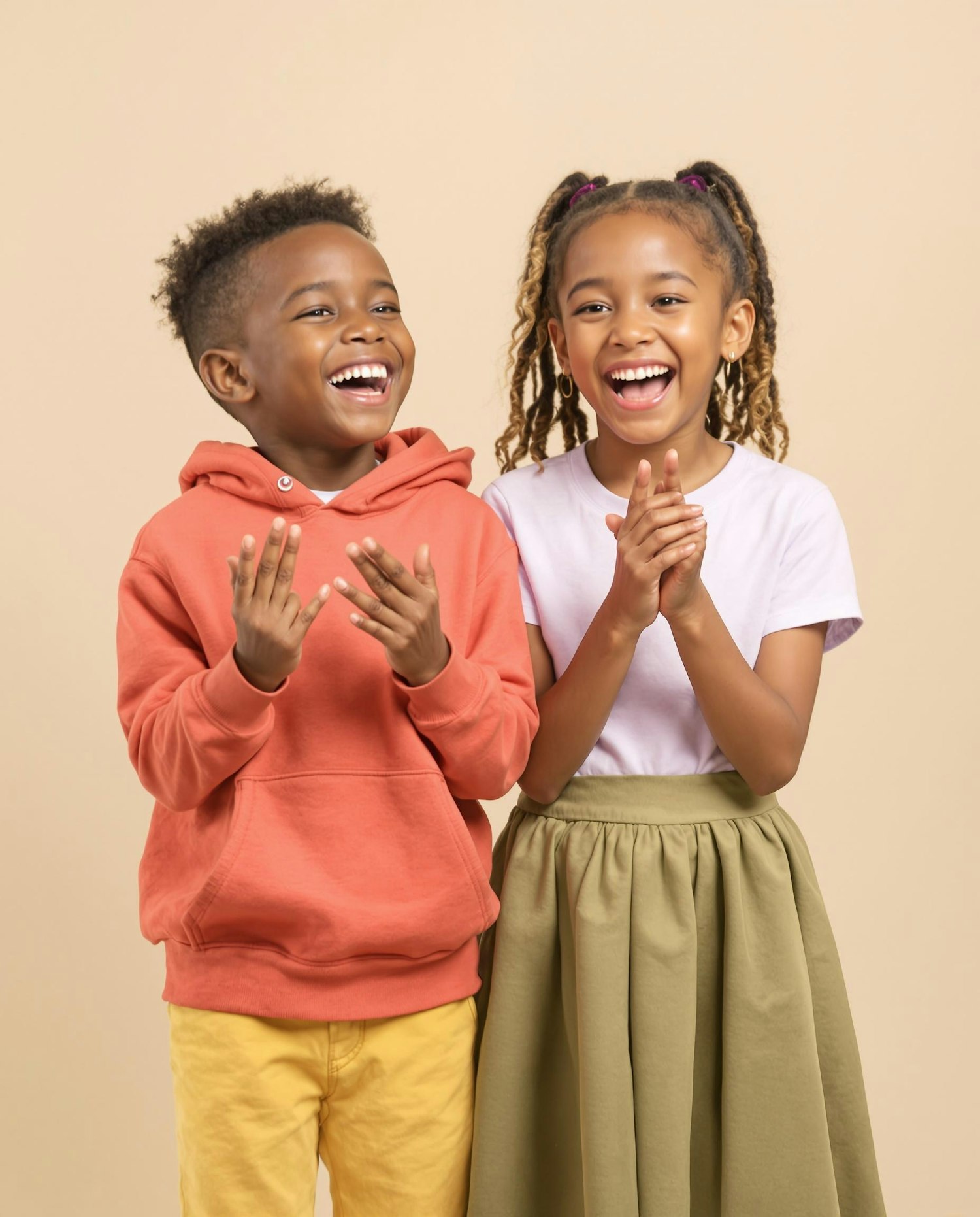 Two cheerful kids clapping and laughing together, dressed in vibrant outfits against a beige background. Pure joy and fun!
