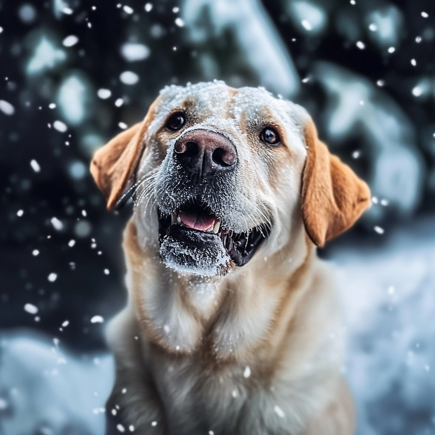 Golden Labrador retriever enjoying a snowy day, with snowflakes on its fur and a joyful expression. Winter wonderland scene.