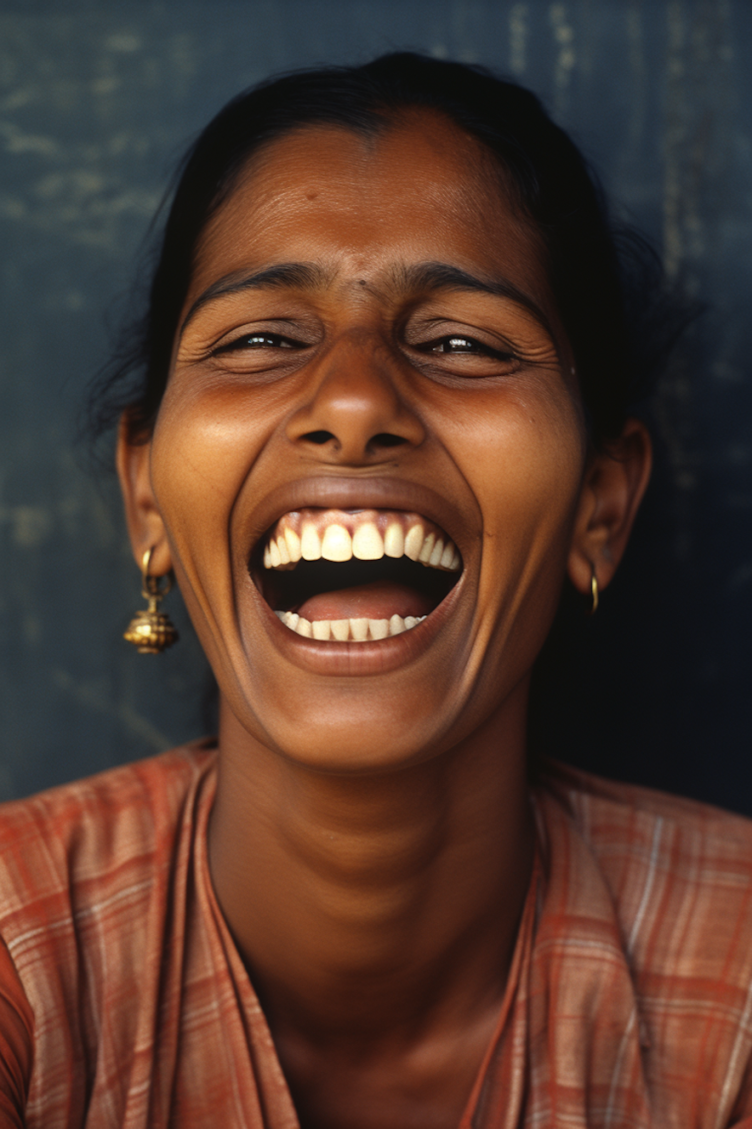 Joyful woman with dark skin and gold earrings laughing, wearing a patterned garment. Vibrant expression against a muted blue background.