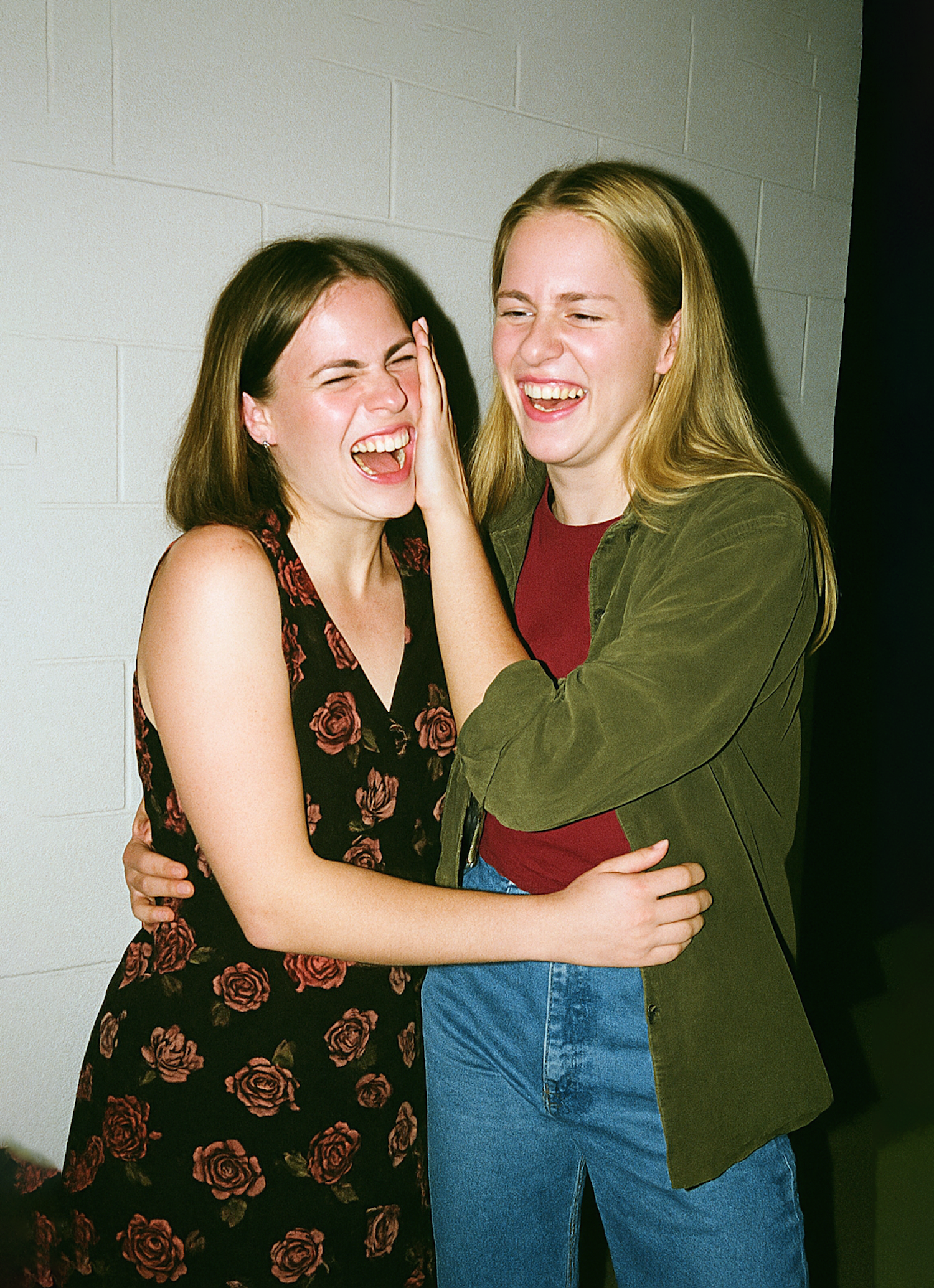 Two women laughing together, one in a floral dress and the other in a green jacket, sharing a joyful and candid moment indoors.