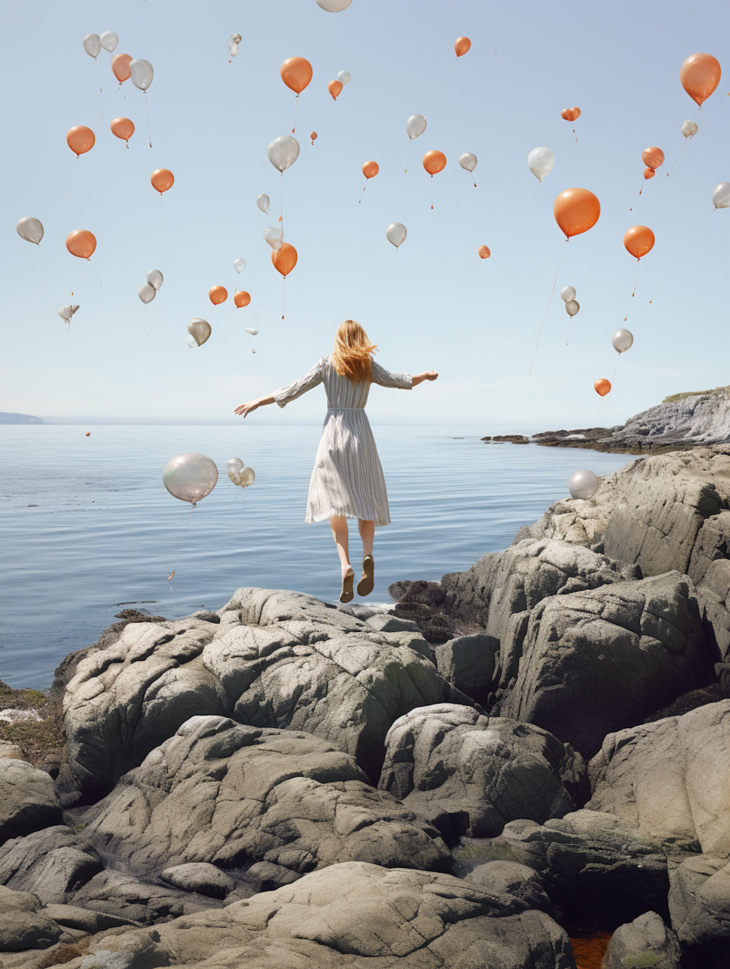 A woman in a flowing dress stands on rocks by the sea, surrounded by floating orange and white balloons under a clear blue sky.