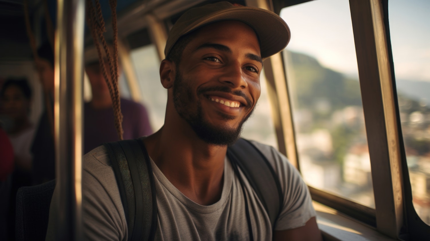 Smiling young man with a cap and backpack on a bus, sunlight streaming through the window, creating a warm and inviting atmosphere.