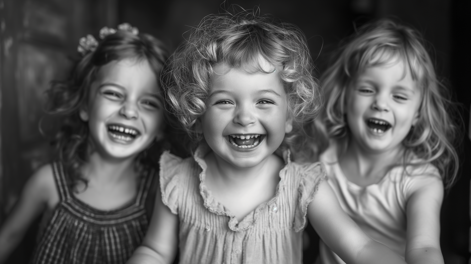 Three children laughing joyfully in a black and white photo, capturing a moment of pure happiness and friendship.