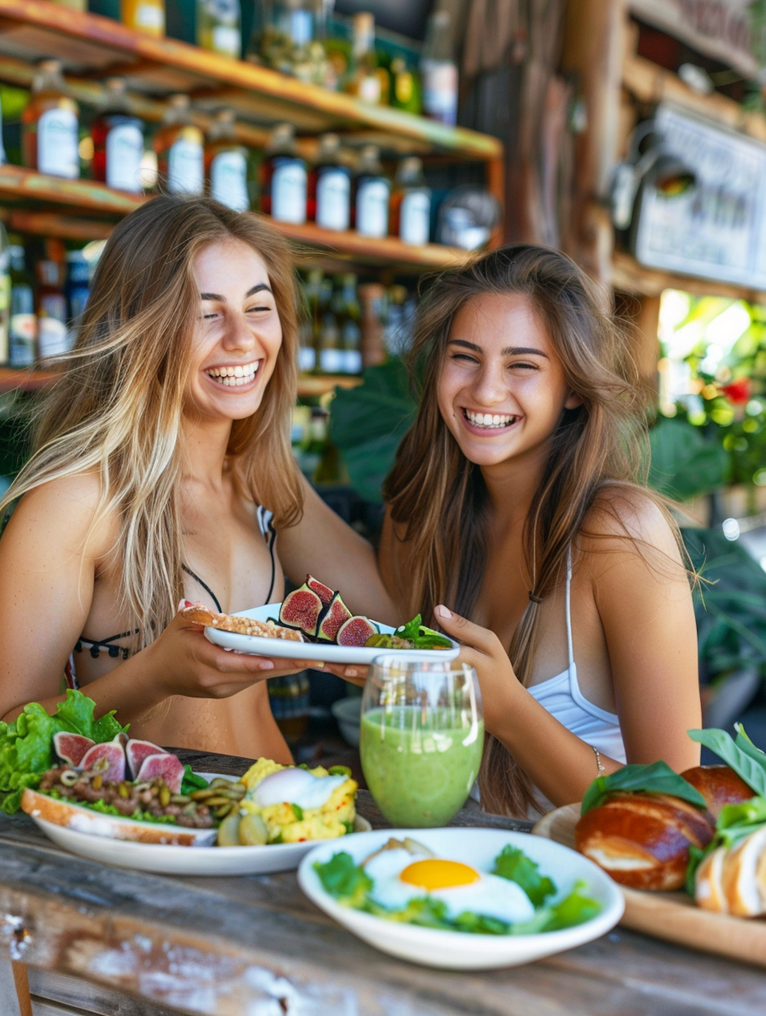 Two women enjoying a vibrant outdoor meal with fresh figs, eggs, and smoothies, surrounded by a lively backdrop of bottles and jars.