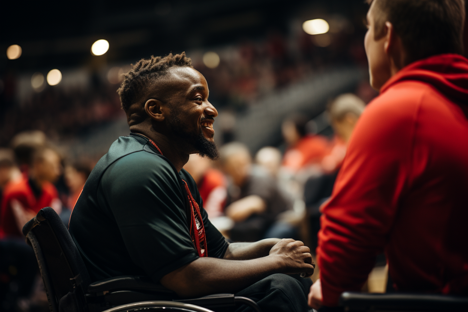 A joyful man in a wheelchair converses at a lively event, wearing a dark green shirt. The setting is warm and crowded.