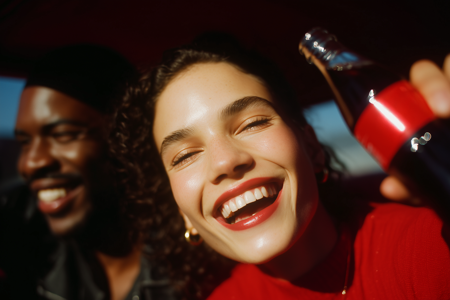 Two friends share a joyful moment, with one holding a soda bottle and smiling brightly, captured in warm, natural lighting.