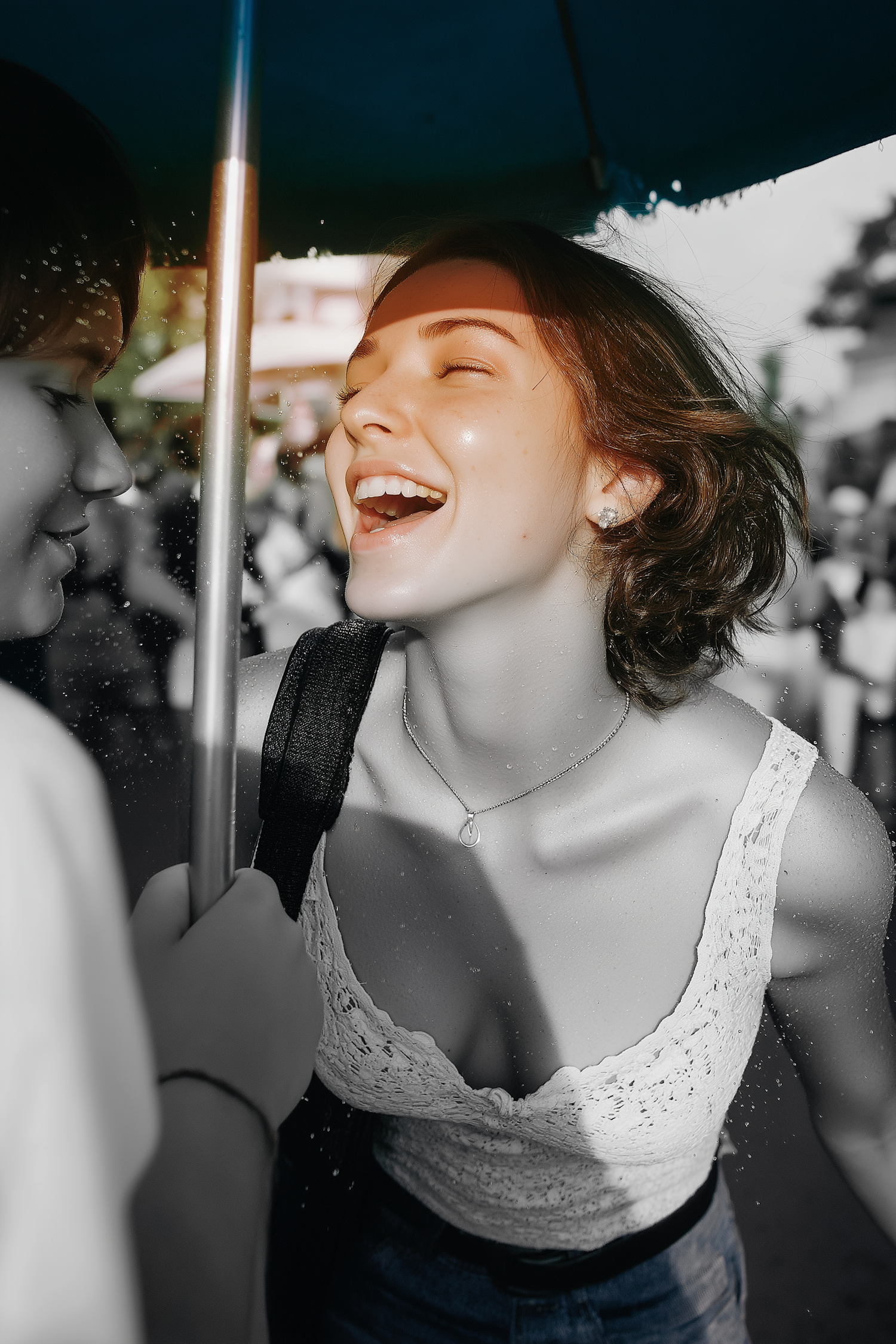 A joyful moment captured as a young woman laughs under an umbrella, with sunlight and water droplets adding vibrancy to the scene.