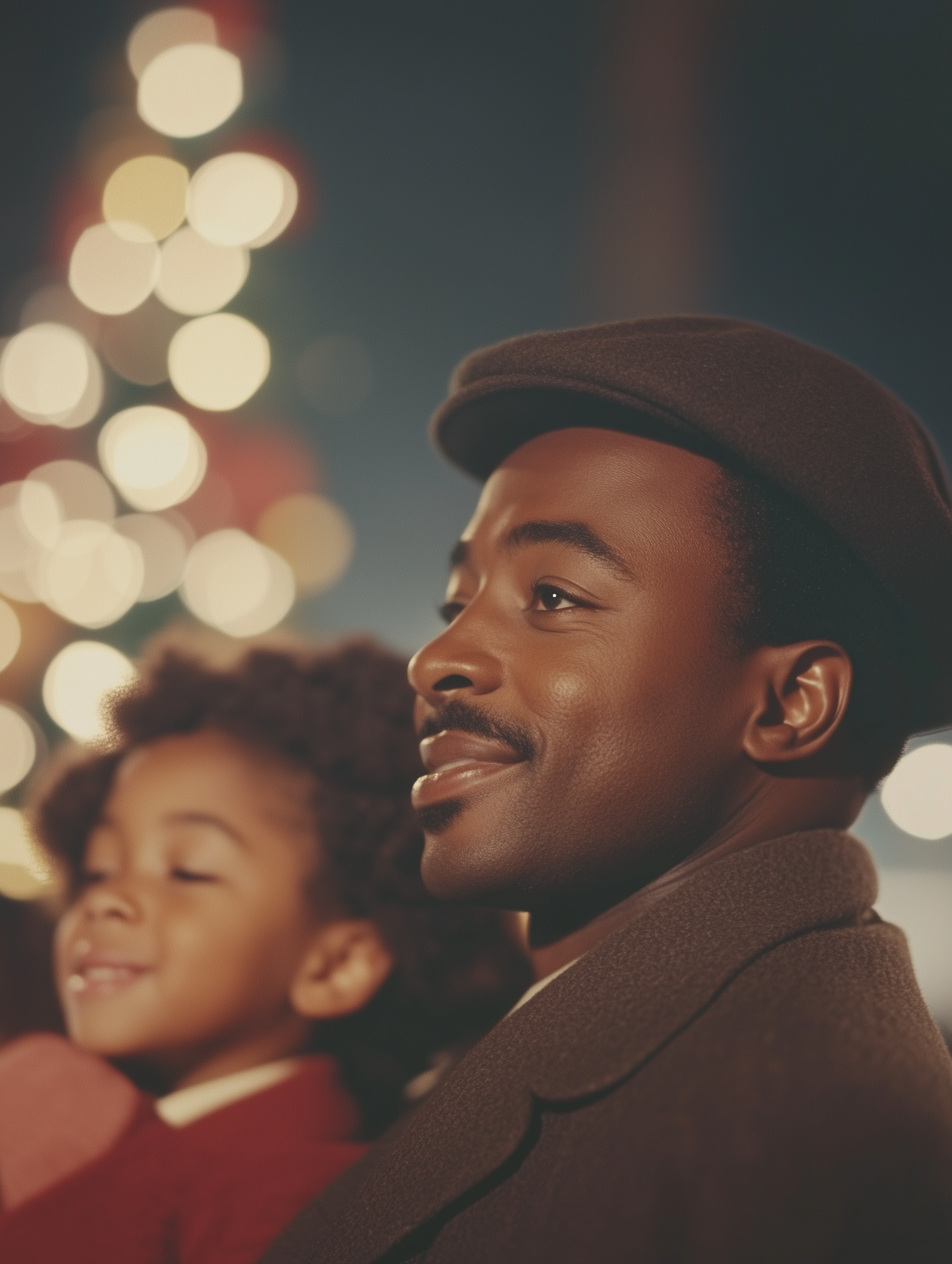 A joyful Black man and child enjoy a festive moment with colorful lights in the background, creating a warm holiday atmosphere.