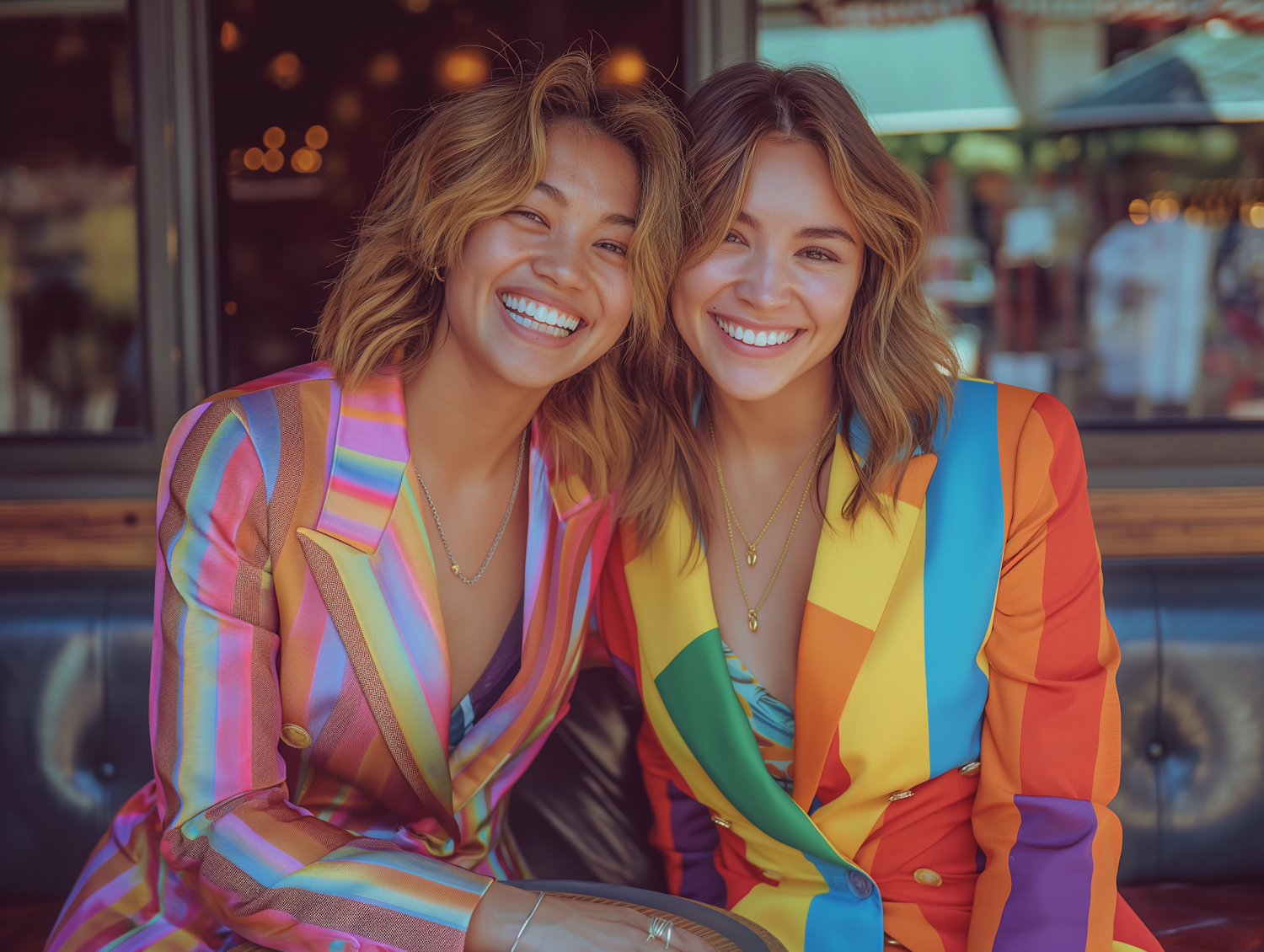 Two women in colorful blazers share a joyful moment, smiling brightly in an outdoor setting.