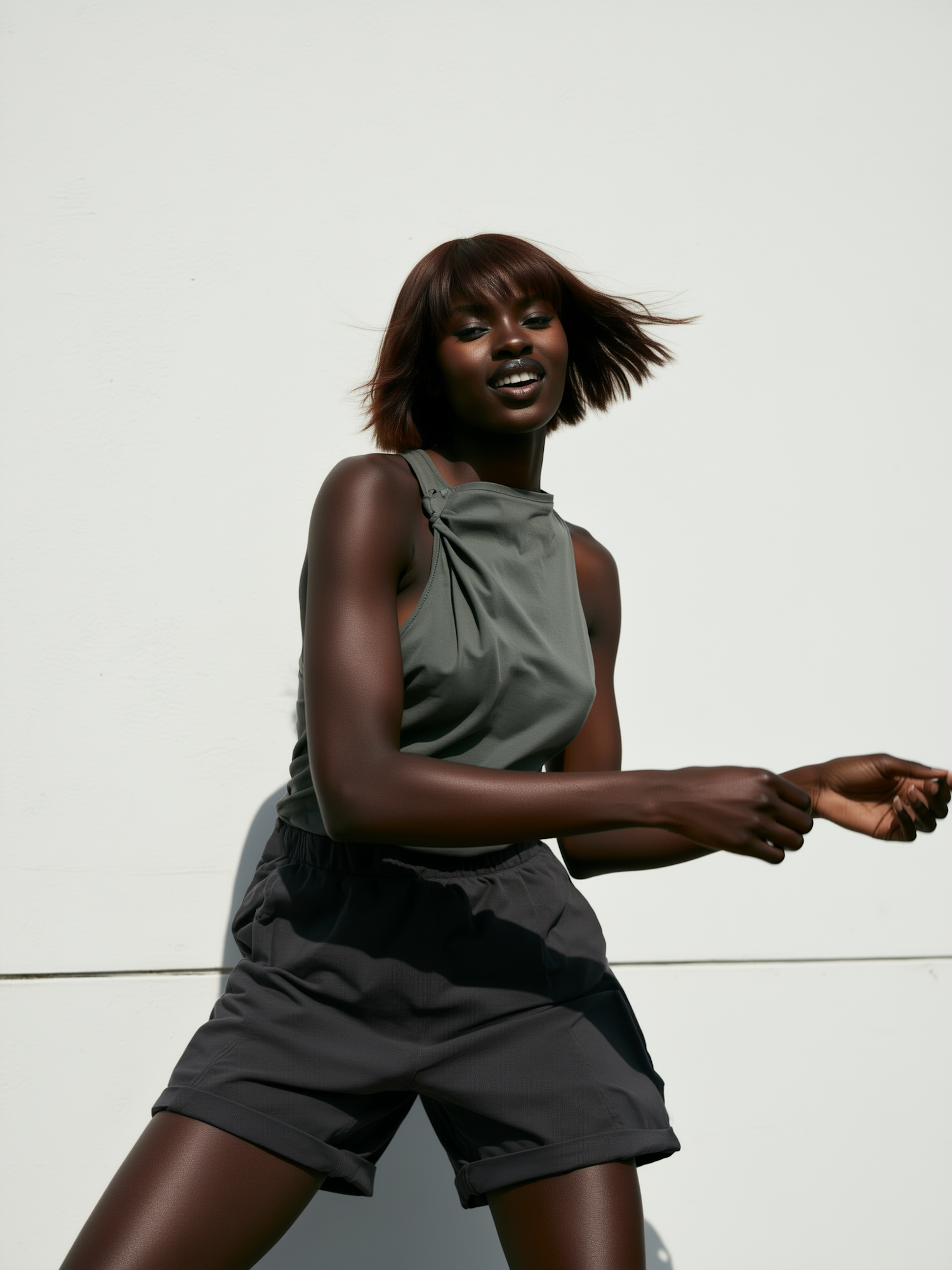 A vibrant portrait of a woman in motion, wearing a gray top and shorts, set against a clean white background.