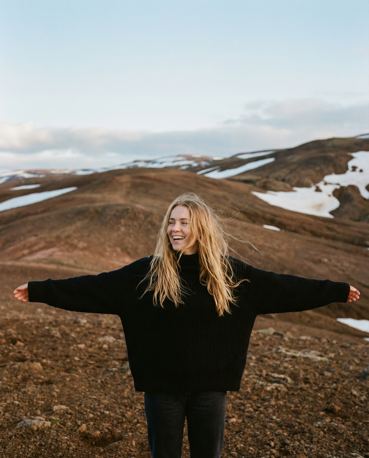 A smiling woman in a black sweater stands with arms outstretched in a scenic, snowy mountain landscape under a clear sky.
