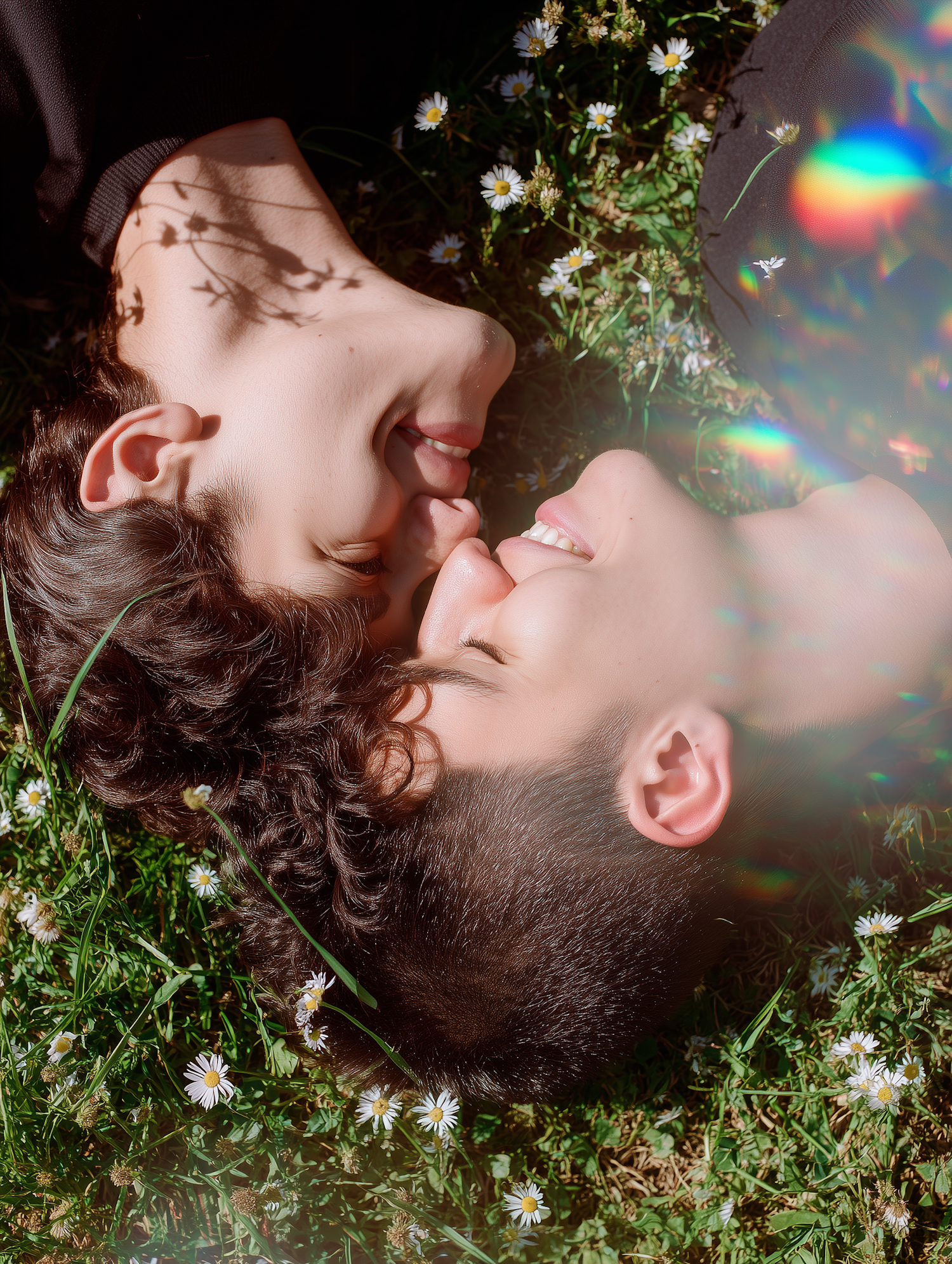 Two people lying in a grassy meadow surrounded by flowers, forming a heartfelt connection. Capturing a dreamy, joyful moment together.