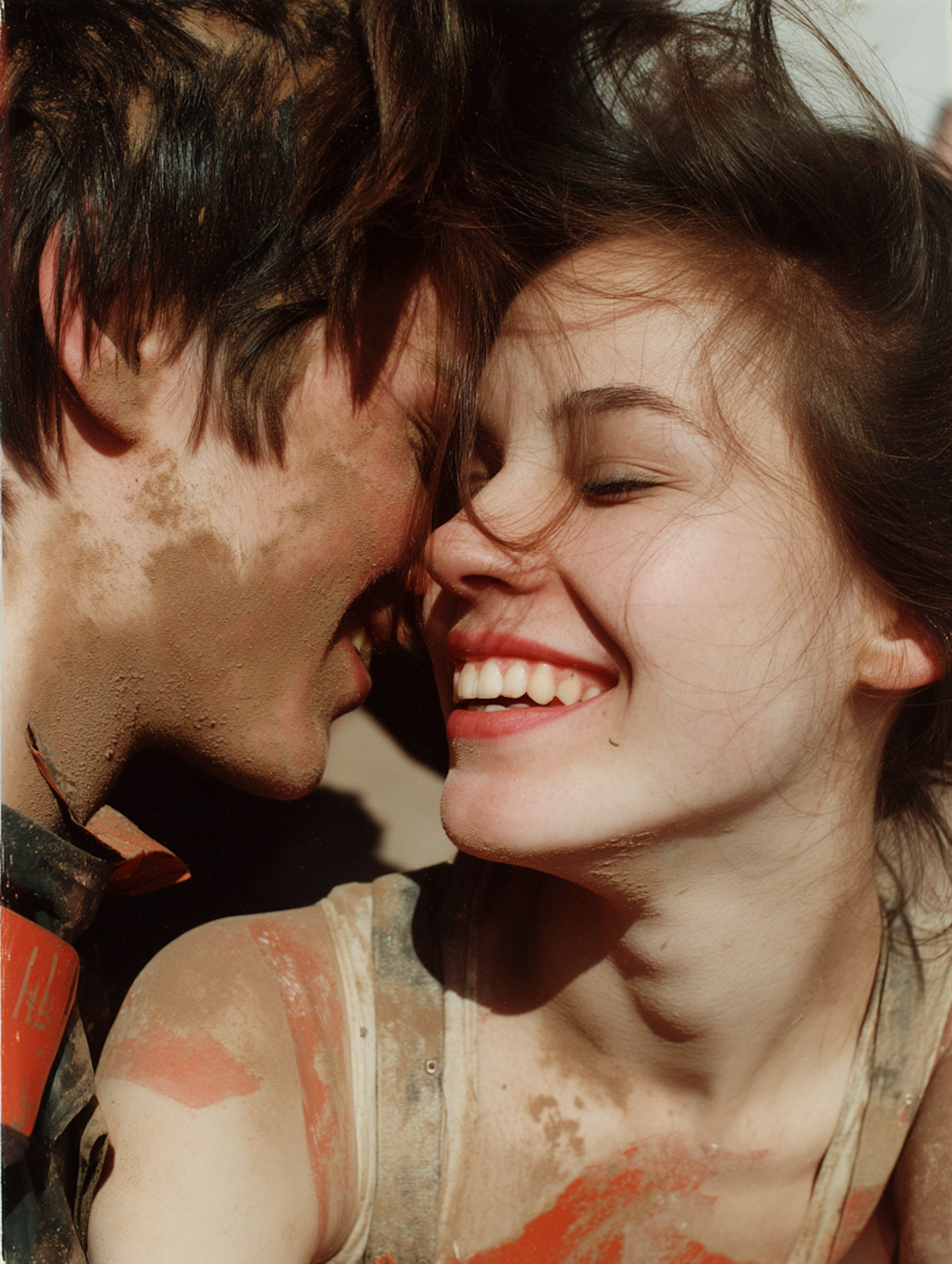 A joyful, dirt-smeared couple sharing a candid, intimate moment outdoors, radiating happiness and connection.