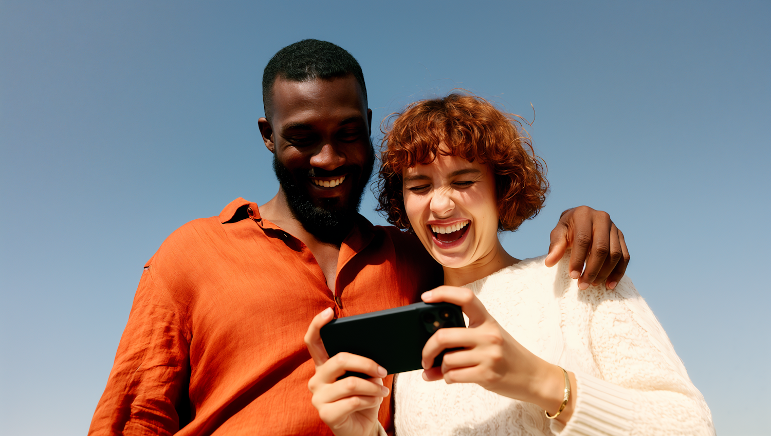 A happy couple shares a laugh while looking at a smartphone outdoors under a clear blue sky, dressed in vibrant and cozy attire.