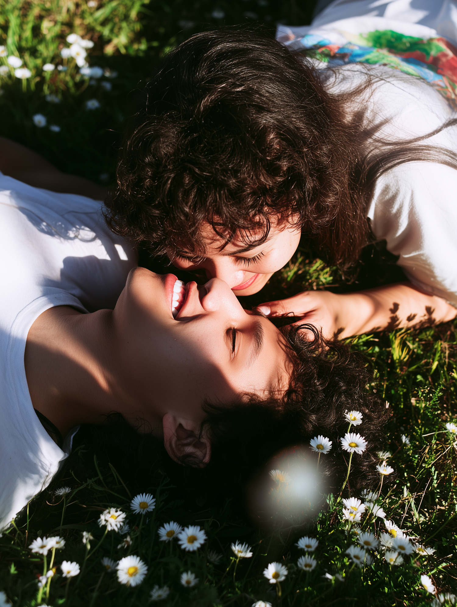 Two people share a joyful moment lying on grass surrounded by small white flowers, their expressions reflecting happiness and affection.