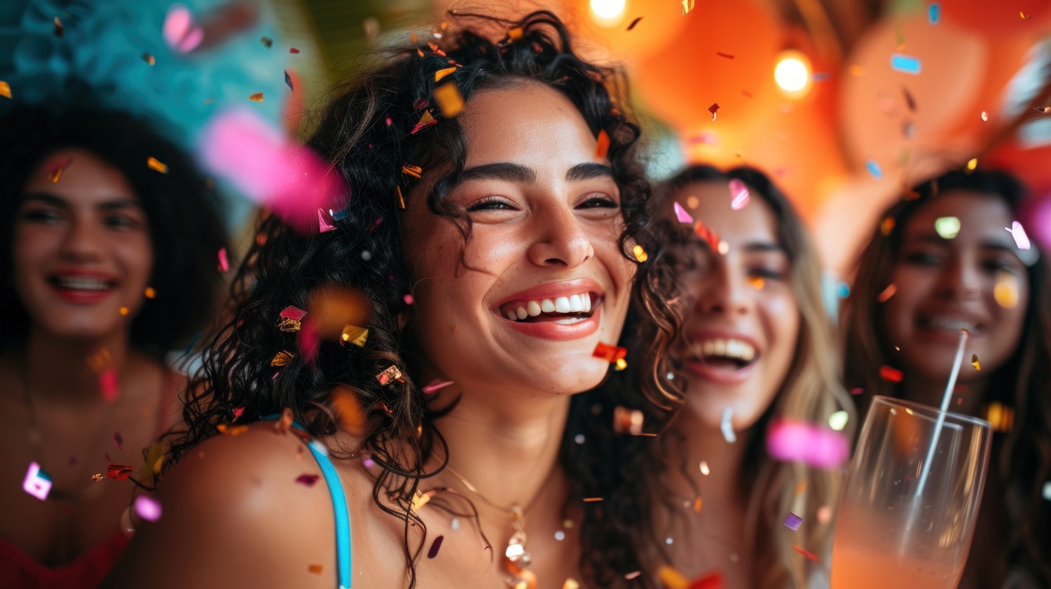 Joyful celebration with friends, colorful confetti, and vibrant balloons. Smiling women enjoying a festive moment together.